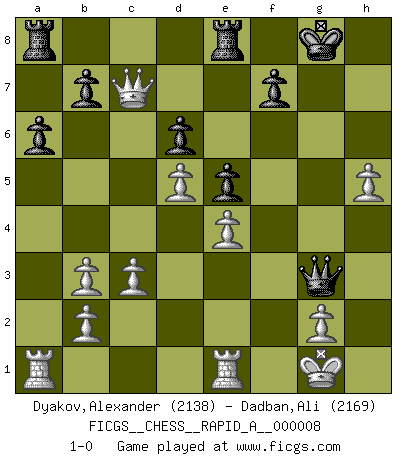 Last move : 1-0 2007 January 23 23:52:28 [Event "FICGS__CHESS__RAPID_A__000008"] [Site "FICGS"] [Date "2006.12.28"] [Round "1"] [White "Dyakov,Alexander"] [Black "Dadban,Ali"] [Result "1-0"] [WhiteElo "2138"] [BlackElo "2169"] 1.e4 e5 2.Nf3 Nc6 3.Bc4 Bc5 4.c3 Nf6 5.d3 a6 6.Bb3 Ba7 7.O-O h6 8.Nbd2 O-O 9.Re1 d6 10.h3 Be6 11.Nf1 Qd7 12.Ng3 g5 13.d4 Bxb3 14.axb3 Rfe8 15.d5 Ne7 16.Nh2 Ng6 17.Qf3 Nf4 18.Ng4 Nxg4 19.hxg4 h5 20.Nxh5 Nxh5 21.gxh5 g4 22.Qf6 Qe7 23.Qf5 Qh4 24.Be3 g3 25.fxg3 Qxg3 26.Bxa7 Rxa7 27.Qd7 R7a8 28.Qxc7 1-0 Giuoco Piano Kingside Castling by player White (move 7) Kingside Castling by player Black (move 8) Player White won this chess game. Follow this game move after move (download)Bobby Fischer is the greatest Chess player who has ever lived. (Ken Smith) Wenn Du nicht kämpfst, um anderen etwas zu beweisen, sondern nur für Dich selbst, dann bist du fast unbesiegbar. (Garry Kasparov) El Ajedrez es un regaderazo frío para la mente. (Sir John Simon) Même un GMI sait rarement calculer sur plus de cinq coups une attaque à sacrifices. (Rudolf Spielmann) Heh, heh, heh. Time to abandon ship. (General Grievous in Star Wars ep.3)