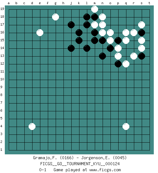 Last move : 0-1 2011 August 5 3:33:50 [Event "FICGS__GO__TOURNAMENT_KYU__000124"] [Site "FICGS"] [Date "2011.07.17"] [Round "1"] [Black "Gramajo,Francisco"] [White "Jorgenson,Evan"] [Result "0-1"] [Rating 1 "0166"] [Rating 2 "0045"] 1.k16 q4 2.k15 d4 3.j14 q16 4.l14 e16 5.j17 g18 6.l17 n18 7.m15 n16 8.m16 m17 9.m18 n17 10.n15 o15 11.o14 p14 12.p15 o16 13.q14 p13 14.n13 q15 15.r15 r16 16.r14 m19 17.l18 s15 18.s16 s14 19.s13 r13 20.q13 q12 21.p12 s17 0-1 Here are the names of the openings (joseki) played in the four corners : Corner q16 : q16 l14 Hoshi (Hwajeom, Seongjeom, Xingwei`) 4-4 Point. The star or hoshi (4-4) point, emphasizing influence at the potential expense of territory. Corner d16 : j14 e16 This joseki is unknown. A weak or weird move has probably been played in this corner. Corner q4 : q4 0-1 Hoshi (Hwajeom, Seongjeom, Xingwei`) 4-4 Point. The star or hoshi (4-4) point, emphasizing influence at the potential expense of territory. Player White won this Go (weiqi, baduk) game. Follow this game move after move (download)Add one stone, then sacrifice both. (Anonymous) Life is pleasant. Death is peaceful. It's the transition that's troublesome. (Isaac Asimov)