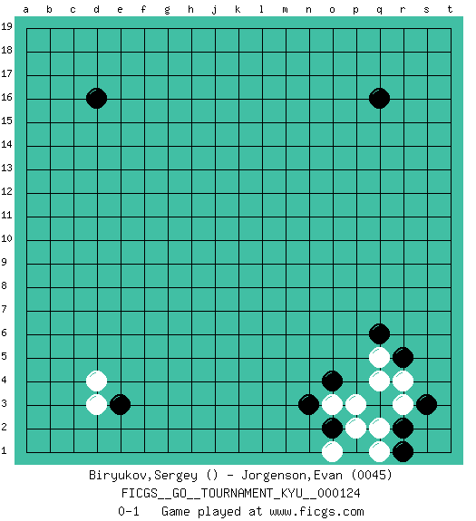 Last move : 0-1 2011 September 4 15:11:36 [Event "FICGS__GO__TOURNAMENT_KYU__000124 "] [Site "FICGS"] [Date "2011.07.17"] [Round "1"] [Black "Biryukov,Sergey "] [White "Jorgenson,Evan "] [Result "0-1"] [Rating 2 "0045"] 1.q16 d4 2.d16 q4 3.o4 p3 4.e3 d3 5.r5 r4 6.s3 r3 7.r2 q2 8.r1 q1 9.o2 o3 10.n3 q5 11.q6 o1 12.p1 p2 0-1 Here are the names of the openings (joseki) played in the four corners : Corner q4 : q4 o4Hoshi (Hwajeom, Seongjeom, Xingwei`) 4-4 Point. The star or hoshi (4-4) point, emphasizing influence at the potential expense of territory.Ikken Takagakari (Hankan Nop'dakeolch'im, Yi Gaojia, 1-Space High Approach). White typically responds at 6-4 or 3-10. White 4-10 is played when White finds play on the right side advantageous. White 4-8 or 3-8 may be played when White has support at top. Corner d4 : d4 e3Hoshi (Hwajeom, Seongjeom, Xingwei`) 4-4 Point. The star or hoshi (4-4) point, emphasizing influence at the potential expense of territory. Player White won this Go (weiqi, baduk) game.Follow this game move after move (download ) Eyes win semiais. (Anonymous) Hold em is to stud what chess is to checkers. (Johnny Moss)