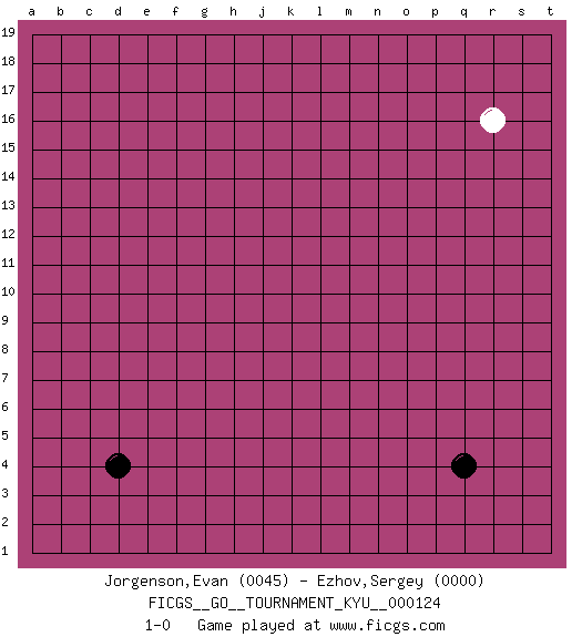 Last move : 1-0 2011 August 18 9:44:27 [Event "FICGS__GO__TOURNAMENT_KYU__000124"] [Site "FICGS"] [Date "2011.07.17"] [Round "1"] [Black "Jorgenson,Evan"] [White "Ezhov,Sergey"] [Result "1-0"] [Rating 1 "0045"] [Rating 2 "0000"] 1.q4 r16 2.d4 1-0 This go game has been lost on time (started : 2011.07.17 18:10:46) Here are the names of the openings (joseki) played in the four corners : Corner d4 : d4 1-0 Hoshi (Hwajeom, Seongjeom, Xingwei`) 4-4 Point. The star or hoshi (4-4) point, emphasizing influence at the potential expense of territory. Player Black won this Go (weiqi, baduk) game. Follow this game move after move (download)Don't make territory near thickness. (Anonymous) Wipe them out. All of them. (Darth Sidious in Star Wars ep.1)