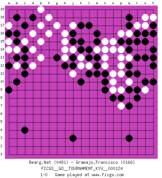 Last move : 1-0 2011 August 30 7:18:7 [Event "FICGS__GO__TOURNAMENT_KYU__000124"] [Site "FICGS"] [Date "2011.07.17"] [Round "1"] [Black "Bearg,Nat"] [White "Gramajo,Francisco"] [Result "1-0"] [Rating 1 "0481"] [Rating 2 "0166"] 1.q3 d16 2.r16 e15 3.c4 d14 4.c17 e17 5.k10 f16 6.j3 g17 7.c11 e13 8.l17 h16 9.r9 j17 10.g13 d12 11.c13 b14 12.c14 c15 13.c12 b12 14.b13 b11 15.b10 a10 16.a12 a11 17.a9 a15 18.d18 f18 19.b16 e19 20.b15 a14 21.b18 a17 22.a16 b12 23.j16 k16 24.j15 h15 25.k15 l16 26.k17 l15 27.l14 j14 28.k14 k13 29.l13 m14 30.m13 n14 31.o14 n13 32.m12 l12 33.m11 n12 34.n11 o11 35.n10 o10 36.n9 o9 37.l11 k12 38.j13 h13 39.j12 j11 40.h12 h14 41.o13 o15 42.o12 p12 43.m15 n15 44.m16 p14 45.p15 p13 46.o8 p16 47.q15 q16 48.q14 q13 49.r13 r14 50.r15 s14 51.s13 t13 52.t12 t15 53.s15 s12 54.t14 t16 55.t17 r17 56.q17 s17 57.s16 s18 58.q18 t18 59.t16 r12 60.q11 t11 61.t13 s11 62.r11 o14 63.q12 p11 64.s10 s9 65.t10 q10 66.q9 p9 67.p8 q8 68.r8 p7 69.q7 1-0 Here are the names of the openings (joseki) played in the four corners : Player Black won this Go (weiqi, baduk) game. Follow this game move after move (download)The monkey jump is worth eight points. (Anonymous) The best weapon against an enemy is another enemy. (Friedrich Nietzsche)