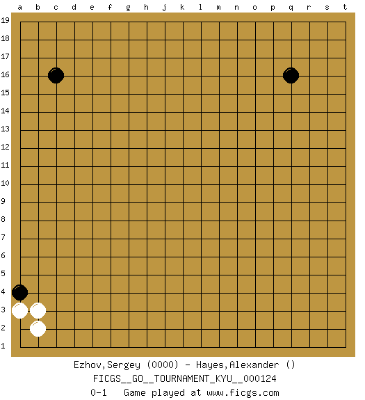 Last move : 0-1 2011 August 20 21:53:8 [Event "FICGS__GO__TOURNAMENT_KYU__000124"] [Site "FICGS"] [Date "2011.07.17"] [Round "1"] [Black "Ezhov,Sergey"] [White "Hayes,Alexander"] [Result "0-1"] [Rating 1 "0000"] 1.q16 b2 2.c16 a3 3.a4 b3 0-1 This go game has been lost on time (started : 2011.07.17 18:10:46) Here are the names of the openings (joseki) played in the four corners : Player White won this Go (weiqi, baduk) game. Follow this game move after move (download)... {it is} something unearthly... if there are sentient beings on other planets, then they play go. (Emanuel Lasker, chess world champion) In my experience, there's no such thing as luck. (Obi-Wan Kenobi in Star Wars ep.4)