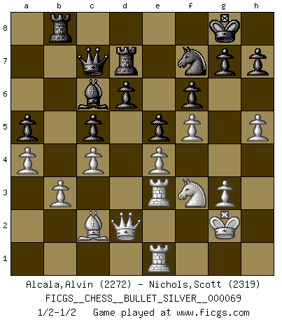 Last move : 1/2-1/2 2011 July 17 19:37:26 [Event "FICGS__CHESS__BULLET_SILVER__000069"] [Site "FICGS"] [Date "2011.07.17"] [Round "1"] [White "Alcala,Alvin"] [Black "Nichols,Scott"] [Result "1/2-1/2"] [WhiteElo "2272"] [BlackElo "2319"] 1.e4 c5 2.Nf3 e6 3.b3 a6 4.Bb2 Nc6 5.c4 Qc7 6.Bd3 Nge7 7.h4 b6 8.h5 Bb7 9.Nc3 Ng8 10.Na4 f6 11.O-O Nh6 12.Rc1 Be7 13.Bb1 Ng4 14.d4 Nxd4 15.Bxd4 cxd4 16.Qxd4 Bc5 17.Nxc5 bxc5 18.Qd2 Bc6 19.Rfe1 a5 20.a4 O-O 21.Rc3 Rab8 22.Bc2 Rf7 23.g3 Qb7 24.Nh2 Nh6 25.f4 Qb4 26.R1e3 Re7 27.Bd1 e5 28.f5 Nf7 29.Nf3 Qb7 30.Bc2 d6 31.Re1 Rd7 32.Rce3 Qc7 33.Kg2 1/2-1/2 Sicilian defense Kingside Castling by player White (move 11) Kingside Castling by player Black (move 20) This chess game ended in a draw. Follow this game move after move (download)Mistrust is the most necessary characteristic of the Chess player. (Siegbert Tarrasch) Modernes Schach sorgt sich zuviel um Dinge wie Bauernstruktur usw. Vergessen Sie das, Schachmatt beendet das Spiel! (Nigel Short) Cuando tengo las piezas blancas, yo gano porque soy blanco; Cuando tengo las piezas negras, yo gano porque soy Bogolyubov. (Bogolyubov) Tout change constamment, y compris dans le monde des Echecs. (Botvinnik) Secret operations are essential in war; upon them the army relies to make its every move. (Sun Tzu)