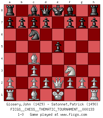 Last move : 1-0 2011 September 11 22:20:44 [Event "FICGS__CHESS__THEMATIC_TOURNAMENT__000133"] [Site "FICGS"] [Date "2011.07.19"] [Round "1"] [White "Glosery,John"] [Black "Satonnet,Patrick"] [Result "1-0"] [WhiteElo "1429"] [BlackElo "1490"] 1.e4 e5 2.Bc4 Nf6 3.Nc3 Nc6 4.Nf3 Nxe4 5.Qe2 Nxc3 6.bxc3 1-0 This chess game has been lost on time (started : 2011.07.19 22:2:8) Bishop's Opening : Berlin defense Player White won this chess game. Follow this game move after move (download)Many have become Chess Masters, no one has become the Master of Chess. (Siegbert Tarrasch) Mein Name ist Rustam Kamsky. Sie haben meinen Sohn belästigt. Bereiten Sie sich aufs Sterben vor. (Rustam Kamsky) Yo siempre he tenido un ligero sentimiento de lástima por una persona que no tiene conocimiento del Ajedrez. (Siegbert Tarrasch) Des points faibles ou des trous dans la position de l'adversaire doivent être occupés par des pièces et non pas par des pions. (Siegbert Tarrasch) All politicians must be presumed guilty until they are proven innocent. (Dinesh De Silva)