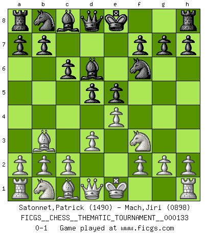 Last move : 0-1 2011 September 27 10:58:39 [Event "FICGS__CHESS__THEMATIC_TOURNAMENT__000133"] [Site "FICGS"] [Date "2011.07.19"] [Round "1"] [White "Satonnet,Patrick"] [Black "Mach,Jiri"] [Result "0-1"] [WhiteElo "1490"] [BlackElo "0898"] 1.e4 e5 2.Bc4 Nf6 3.d3 c6 4.Nf3 d5 5.Bb3 Bd6 0-1 This chess game has been lost on time (started : 2011.07.19 22:2:8) Bishop's Opening : Berlin defense Player Black won this chess game. Follow this game move after move (download)There is only one thing Fischer does in Chess without pleasure: to lose ! (Boris Spassky) Wenn Du nicht kämpfst, um anderen etwas zu beweisen, sondern nur für Dich selbst, dann bist du fast unbesiegbar. (Garry Kasparov) El pensamiento metódico es mas útil en el Ajedrez que la inspiración. (C. J. S. Purdy) Lorsque vous vous retrouvez devant une position atroce, ne tendez pas un ultime piège dérisoire avec l'intention d'abandonner si l'adversaire le déjoue ! Faites-vous plutôt un devoir de résister comme si votre vie en dépendait. Jouez le coup qui vous déplairait au centuple si vous étiez dans la peau de votre tortionnaire ! Crush them ! Make them suffer ! (General Grievous in Star Wars ep.3)