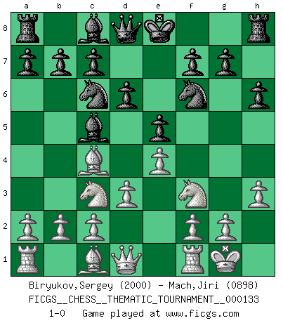 Last move : 1-0 2011 September 15 10:20:23 [Event "FICGS__CHESS__THEMATIC_TOURNAMENT__000133"] [Site "FICGS"] [Date "2011.07.19"] [Round "1"] [White "Biryukov,Sergey"] [Black "Mach,Jiri"] [Result "1-0"] [WhiteElo "2000"] [BlackElo "0898"] 1.e4 e5 2.Bc4 Nf6 3.d3 Nc6 4.Nf3 Bc5 5.h3 d6 6.O-O h6 7.Nc3 1-0 This chess game has been lost on time (started : 2011.07.19 22:2:8) Bishop's Opening : Berlin defense Kingside Castling by player White (move 6) Player White won this chess game. Follow this game move after move (download)You have to have the fighting spirit. You have to force moves and take chances. (Bobby Fischer) Die größte Kunst beim Schach besteht darin dem Gegner nicht zu zeigen was er tun kann. (Garry Kasparov) No nos podemos resistir a la fascinación de un sacrificio ya que la pasión por los sacrificios es parte de la naturaleza de un jugador de Ajedrez. (Rudolf Spielman) Même si l'adversaire joue le coup analysé précédemment, recommencez l'analyse en voyant la nouvelle position. Première règle de Blumenfeld Experience is the name we all give to our mistakes. (Oscar Wilde)