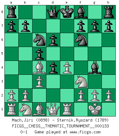 Last move : 0-1 2011 September 15 22:23:44 [Event "FICGS__CHESS__THEMATIC_TOURNAMENT__000133"] [Site "FICGS"] [Date "2011.07.19"] [Round "1"] [White "Mach,Jiri"] [Black "Sternik,Ryszard"] [Result "0-1"] [WhiteElo "0898"] [BlackElo "1789"] 1.e4 e5 2.Bc4 Nf6 3.d4 exd4 4.Nf3 c5 5.O-O Nc6 6.Re1 d6 7.c3 Bg4 0-1 This chess game has been lost on time (started : 2011.07.19 22:2:8) Bishop's Opening : Urusov gambit Kingside Castling by player White (move 5) Player Black won this chess game. Follow this game move after move (download)I believe that Chess possesses a magic that is also a help in advanced age. A rheumatic knee is forgotten during a game of Chess and other events can seem quite unimportant in comparison with a catastrophe on the chessboard. (Vlastimil Hort) Ja, jede Frau in Holland liebt mich bestimmt, und alle Männer hassen mich. (Loek van Wely) El Ajedrez es realmente noventa y nueve por ciento calculación. (Soltis) Je fais ceci parce que dans cinquante coups j'obtiendrai cela; je m'appelle Mikhail Moisevitch Botvinnik. (Botvinnik) Wawaweewa ! (Borat: Cultural learnings of America for make benefit glorious nation of Kazakhstan)