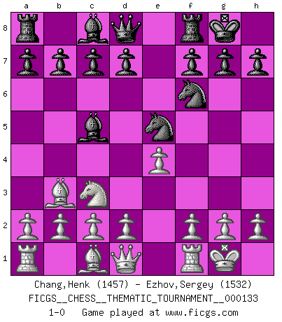 Last move : 1-0 2011 September 4 22:19:9 [Event "FICGS__CHESS__THEMATIC_TOURNAMENT__000133"] [Site "FICGS"] [Date "2011.07.19"] [Round "1"] [White "Chang,Henk"] [Black "Ezhov,Sergey"] [Result "1-0"] [WhiteElo "1457"] [BlackElo "1532"] 1.e4 e5 2.Bc4 Nf6 3.Nc3 Nc6 4.Nf3 Bc5 5.O-O O-O 6.Nxe5 Nxe5 7.Bb3 1-0 This chess game has been lost on time (started : 2011.07.19 22:2:8) Bishop's Opening : Berlin defense Kingside Castling by player White (move 5) Kingside Castling by player Black (move 5) Player White won this chess game. Follow this game move after move (download)Live, lose, and learn, by observing your opponent how to win. (Amber Steenbock) Modernes Schach erfordert enorme Anspannung. Es ist für einen normalen Menschen unmöglich das auszuhalten. (Viktor Kortschnoi) Cuando le juegas a Fischer, no es una cuestion de si vas a ganar o perder. Es una cuestion de si vas a sobrevivir. (Boris Spassky) Je crois qu'il existe des manières très spécifiques de jouer efficacement contre une machine. Evidemment, nous n'avons aucune chance en technique pure, parce que l'ordinateur calcule de manière parfaite. Mais lorsque nous faisons appel à notre cerveau, en utilisant l'intuition et la compréhension, alors nous restons beaucoup plus forts. (Anatoli Karpov) To steal ideas from one person is plagiarism. To steal from many is research. (Unknown)