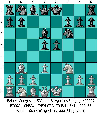 Last move : 0-1 2011 September 1 22:14:51 [Event "FICGS__CHESS__THEMATIC_TOURNAMENT__000133"] [Site "FICGS"] [Date "2011.07.19"] [Round "1"] [White "Ezhov,Sergey"] [Black "Biryukov,Sergey"] [Result "0-1"] [WhiteElo "1532"] [BlackElo "2000"] 1.e4 e5 2.Bc4 Nf6 3.d3 c6 4.Nf3 d5 5.Bb3 Bd6 6.exd5 cxd5 0-1 This chess game has been lost on time (started : 2011.07.19 22:2:8) Bishop's Opening : Berlin defense Player Black won this chess game. Follow this game move after move (download)Even the laziest King flees wildly in the face of a double check ! (Aaron Nimzowitsch) Du musst nicht gut spielen, es reicht, wenn du besser spielst als dein Gegner. (Anonymous) El Ajedrez por encima de todo... ¡es una pelea!. (Emanuel Lasker) Je ne suis pas le dernier à jouer lâchement des coups douteux pendant le zeïtnot de l'adversaire pour l'achever: en effet les coups qui font le plus peur sont ceux que l'on ne comprend pas. Je me fais souvent peur quand je joue. (Un professeur anonyme) Chess, like love, like music, has the power to make people happy. (Siegbert Tarrasch)