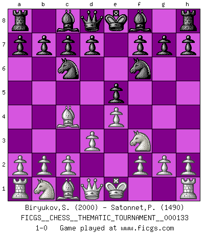 Last move : 1-0 2011 September 15 22:23:44 [Event "FICGS__CHESS__THEMATIC_TOURNAMENT__000133"] [Site "FICGS"] [Date "2011.07.19"] [Round "1"] [White "Biryukov,Sergey"] [Black "Satonnet,Patrick"] [Result "1-0"] [WhiteElo "2000"] [BlackElo "1490"] 1.e4 e5 2.Bc4 Nf6 3.d3 Nc6 4.Nf3 1-0 This chess game has been lost on time (started : 2011.07.19 22:2:8) Bishop's Opening : Berlin defense Player White won this chess game. Follow this game move after move (download)Play the opening like a book, the middle game like a magician, and the endgame like a machine. (Spielmann) Es ist besser die Steine des Gegners zu opfern. (Savielly Grigorievitsch Tartakower) Las combinaciones han sido siempre el aspecto más intrigante del Ajedrez. Los Maestros las buscan, el público las aplauden, los críticos las alaban. La razón se debe a que las combinaciones hacen posible que el Ajedrez sea más que un ejercicio matemático con una carencia de vida. Ellas son la poesía del juego, son del Ajedrez lo que la melodía es de la música. Ellas representan el triunfo de la mente sobre la materia. (Reuben Fine) Mon pion favori sur ma case favorite ! Bronstein en parlant d'un coup de pion en h5 quand il avait les Noirs. May the force be with you. (Han Solo in Star Wars ep.4)