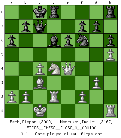 Last move : 0-1 2011 December 1 21:57:1 [Event "FICGS__CHESS__CLASS_A__000100"] [Site "FICGS"] [Date "2011.07.20"] [Round "1"] [White "Pech,Stepan"] [Black "Mamrukov,Dmitri"] [Result "0-1"] [WhiteElo "2000"] [BlackElo "2167"] 1.e4 c6 2.d4 d5 3.Nc3 dxe4 4.Nxe4 Bf5 5.Ng3 Bg6 6.h4 h6 7.Nf3 Nd7 8.h5 Bh7 9.Bd3 Bxd3 10.Qxd3 e6 11.Bf4 Qa5+ 12.Bd2 Qc7 13.O-O-O Ngf6 14.Ne4 O-O-O 15.g3 Nxe4 16.Qxe4 Bd6 17.c4 c5 18.Bc3 cxd4 19.Nxd4 a6 20.Rd2 Nf6 0-1 Caro-Kann : Classical, 7...Nd7 Queenside Castling by player White (move 13) Queenside Castling by player Black (move 14) Player Black won this chess game. Follow this game move after move (download)It is not enough to be a good player... you must also play well. (Siegbert Tarrasch) Es ist wirklich schade, dass so viele Schachspieler nicht auf ihr Äußeres achten! (Alexandra Kosteniuk) ¿Quién es tu oponente esta tarde? Esta tarde mi oponente son las piezas negras. (Akiba Rubinstein) Des points faibles ou des trous dans la position de l'adversaire doivent être occupés par des pièces et non pas par des pions. (Siegbert Tarrasch) Memory is a complicated thing, a relative to truth, but not its twin. (Barbara Kingsolver, Animal Dreams)