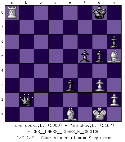 Last move : 1/2-1/2 2011 September 21 1:8:25 [Event "FICGS__CHESS__CLASS_A__000100"] [Site "FICGS"] [Date "2011.07.20"] [Round "1"] [White "Teverovski,Bogoljub"] [Black "Mamrukov,Dmitri"] [Result "1/2-1/2"] [WhiteElo "2000"] [BlackElo "2167"] 1.d4 Nf6 2.c4 e6 3.Nc3 Bb4 4.Nf3 c5 5.g3 cxd4 6.Nxd4 O-O 7.Bg2 d5 8.cxd5 Nxd5 9.Qb3 Nc6 10.Nxc6 bxc6 11.O-O Qa5 12.Bd2 Bxc3 13.bxc3 Ba6 14.Rfd1 Rab8 15.c4 Qc5 16.cxd5 Rxb3 17.axb3 Bxe2 18.Re1 cxd5 19.Rxe2 Qd4 20.Ra4 Qd3 21.Bf1 Qxb3 22.Rxa7 h6 23.Bf4 Rd8 24.Re3 Qb1 25.Rc3 d4 26.Rc1 Qf5 27.Ra3 e5 28.Rc5 f6 29.Bd3 Qd7 30.Bd2 e4 31.Bc4+ Kh7 32.Bd5 Re8 33.Bc6 Qe7 34.Rca5 Rd8 35.Ra1 Qe6 36.Ra6 f5 37.Bb5 Qe5 38.Be2 e3 39.fxe3 dxe3 40.Be1 Rc8 41.Bf3 Rc7 42.Bh5 g5 43.R1a5 Qb2 44.Ra7 Rxa7 45.Rxa7+ Kg8 46.Ra8+ 1/2-1/2 Nimzo-Indian : Three knights variation Kingside Castling by player Black (move 6) Kingside Castling by player White (move 11) This chess game ended in a draw. Follow this game move after move (download)The Chess pieces are the block alphabet which shapes thoughts; and these thoughts, although making a visual design on the chessboard, express their beauty abstractly, like a poem. (Marcel Duchamp) Ich moechte nie einem Club beitreten, der Leute wie mich als Mitglieder aufnimmt. (Woody Allen) Una clavada es mas poderosa que una espada. (Fred Reinfeld) Les échecs, c'est la lutte contre l'erreur. (Johannes Zukertort) The smarter you play, the luckier you'll be. (Mark Pilarski)