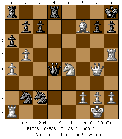 Last move : 1-0 2011 November 16 23:15:16 [Event "FICGS__CHESS__CLASS_A__000100"] [Site "FICGS"] [Date "2011.07.20"] [Round "1"] [White "Kuster,Zeljko"] [Black "Polkwitzauer,Ardiantez"] [Result "1-0"] [WhiteElo "2047"] [BlackElo "2000"] 1.e4 e6 2.d3 d5 3.Nd2 Nc6 4.Ngf3 Nf6 5.c3 e5 6.Be2 Be7 7.O-O O-O 8.b4 a6 9.Bb2 Qd6 10.a4 Rd8 11.exd5 Qxd5 12.Re1 Bf5 13.c4 Qd6 14.b5 Nb4 15.Nxe5 Nd7 16.c5 Nxc5 17.d4 Bf6 18.Bc4 Bxe5 19.Rxe5 Ncd3 20.Rxf5 Nxb2 21.Bxf7+ Kh8 22.Qg4 Nc2 23.Ne4 Qxd4 24.Rh5 1-0 French : King's Indian attack Kingside Castling by player White (move 7) Kingside Castling by player Black (move 7) Player White won this chess game. Follow this game move after move (download)Every Pawn is a potential Queen. (James Mason) Ein Schachspiel besteht aus drei Phasen: Die erste, wenn du hofftst den Vorteil zu haben, die zweite, wenn du glaubst einen Vorteil zu haben, und die dritte.... wenn du weißt Du wirst verlieren. (Savielly Grigorievitsch Tartakower) La caracteristica mas importante en la posición del Ajedrez es la actividad de las piezas. Esto es absolutamente fundamental en todas las fases del juego: Apertura, Juego Medio y especialmente Finales. La limitación primordial en la actividad de una pieza, es la estructuración de los Peones. (Michael Stean) On croit qu'il y a plus de mauvais joueurs que de bons joueurs, c'est faux : Il y a autant de joueurs qui gagnent que de joueurs qui perdent. (Philippe Geluck) The right perception of any matter and a misunderstanding of the same matter do not wholly exclude each other. (Kafka's the trial)