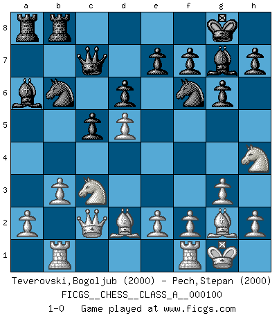 Last move : 1-0 2011 December 1 21:57:22 [Event "FICGS__CHESS__CLASS_A__000100"] [Site "FICGS"] [Date "2011.07.20"] [Round "1"] [White "Teverovski,Bogoljub"] [Black "Pech,Stepan"] [Result "1-0"] [WhiteElo "2000"] [BlackElo "2000"] 1.d4 Nf6 2.c4 c5 3.d5 b5 4.cxb5 a6 5.bxa6 Bxa6 6.g3 d6 7.Bg2 g6 8.Nc3 Bg7 9.Nf3 Nbd7 10.Rb1 O-O 11.O-O Qa5 12.Bd2 Rfb8 13.Qc2 Qc7 14.b3 Nb6 15.Nh4 1-0 Benko gambit accepted Kingside Castling by player Black (move 10) Kingside Castling by player White (move 11) Player White won this chess game. Follow this game move after move (download)Bobby just drops the pieces and they fall on the right squares. (Miguel Najdorf) Ich bewundere Kasparows phantasievolle Angriffssiege aus den Achtzigern und Neunzigern, aber wenn man sie mit dem Computer überprüft, nimmt der Computer in jeder zweiten Partie die Opfer an, verteidigt sich und gewinnt. (Vladimir Kramnik) Ciertamente, de todas la drogas del mundo, el Ajedrez debe ser el mas placentero permamentemente. (Assiac) Soyez une menace à chaque fois que vous vous asseyez pour jouer. (Ken Smith) The difference between stupidity and genius is that genius has its limits. (Murphy)