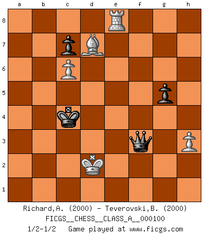 Last move : 1/2-1/2 2011 September 29 16:44:24 [Event "FICGS__CHESS__CLASS_A__000100"] [Site "FICGS"] [Date "2011.07.20"] [Round "1"] [White "Richard,Andy"] [Black "Teverovski,Bogoljub"] [Result "1/2-1/2"] [WhiteElo "2000"] [BlackElo "2000"] 1.d4 Nf6 2.Nf3 e6 3.c4 Bb4+ 4.Nbd2 b6 5.a3 Bxd2+ 6.Bxd2 Bb7 7.Bg5 h6 8.Bh4 d6 9.e3 Nbd7 10.Qc2 Qe7 11.Rd1 a5 12.b3 e5 13.d5 O-O 14.Be2 Rfc8 15.O-O b5 16.cxb5 a4 17.b4 e4 18.Nd4 Bxd5 19.Rd2 Qe8 20.Nc6 g5 21.Bg3 Bxc6 22.bxc6 Nb6 23.Rfd1 Qe7 24.Qb2 Rd8 25.h3 Kh7 26.b5 Ne8 27.Rf1 f5 28.f4 Ng7 29.fxg5 hxg5 30.R2d1 Rf8 31.Qc3 Ne6 32.Qb4 Nc5 33.Be1 f4 34.Bd2 Nb3 35.Bc3 fxe3 36.Rfe1 Rf4 37.Bc4 Nd2 38.Bxd2 exd2 39.Rxd2 Qe5 40.Ba2 Re8 41.Qb2 Kg6 42.Qxe5 Rxe5 43.Bb1 d5 44.Bc2 Kf6 45.Bd1 Nc4 46.Rde2 d4 47.g3 Rf3 48.Rxe4 Rxg3+ 49.Kf2 Rxa3 50.Rxd4 Ra2+ 51.Re2 R5xe2+ 52.Bxe2 Nb6 53.Rd3 a3 54.Ke1 Ra1+ 55.Kd2 Ke5 56.Kc2 Ra2+ 57.Kd1 Na4 58.Rb3 Kd4 59.Bg4 Nc5 60.Rg3 Nd3 61.Bf5 Ra1+ 62.Kd2 a2 63.Rxd3+ Kc5 64.Be6 Rd1+ 65.Kxd1 a1Q+ 66.Ke2 Qb2+ 67.Kd1 Qh2 68.Bd7 Kxb5 69.Rd2 Qe5 70.Re2 Qc3 71.Re8 Qf3+ 72.Kd2 Kc4 1/2-1/2 Queen's pawn game Kingside Castling by player Black (move 13) Kingside Castling by player White (move 15) 10 pieces endgame at move 65 : White KRBPPP , Black KPPP WHITE : King + 1 Rook 1 Bishop 3 Pawns BLACK : King + 3 Pawns Promotion Queen by player Black (move 65) 9 pieces endgame at move 68 : White KRBPP , Black KQPP WHITE : King + 1 Rook 1 Bishop 2 Pawns BLACK : King + 1 Queen 2 Pawns This chess game ended in a draw. Follow this game move after move (download)The enormous mental resilience, without which no Chess player can exist, was so much taken up by Chess that he could never free his mind of this game. (Albert Einstein) Kostenjuk hat keinen Sexappeal. (Loek van Wely) Hasta este punto, las blancas han seguido un análisis bien conocido. Pero ahora el hace un error fatal: empieza a usar su propia cabeza. (Siegbert Tarrasch) Le thème de l'attaque double intervient d'une manière ou d'une autre dans l'immense majorité des combinaisons. (Youri Averbakh) When you stop learning you start dying. (M. Scott Adams)