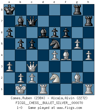 Last move : 1-0 2011 July 20 19:1:25 [Event "FICGS__CHESS__BULLET_SILVER__000070"] [Site "FICGS"] [Date "2011.07.20"] [Round "1"] [White "Comes,Ruben"] [Black "Alcala,Alvin"] [Result "1-0"] [WhiteElo "2384"] [BlackElo "2272"] 1.e4 c5 2.Nf3 d6 3.d4 cxd4 4.Nxd4 Nf6 5.Nc3 a6 6.Bg5 Nbd7 7.f4 e6 8.Qe2 Qc7 9.O-O-O b5 10.a3 Bb7 11.g4 Be7 12.Kb1 h6 13.Bh4 g5 14.fxg5 hxg5 15.Bxg5 Qb6 16.Be3 Qc7 17.Qg2 Nc5 18.Bd3 Rh4 19.h3 O-O-O 20.Nb3 Nfd7 21.Qf2 Ne5 22.Nxc5 dxc5 23.Bf4 Rdh8 24.Bf1 f6 25.Bg2 Kb8 26.Ne2 R4h7 27.h4 Ka8 28.g5 Rg8 29.Qg3 Bd6 30.Qc3 1-0 This chess game has been lost on time (started : 2011.07.20 18:31:47) Sicilian : Najdorf, 6.Bg5 Queenside Castling by player White (move 9) Queenside Castling by player Black (move 19) Player White won this chess game. Follow this game move after move (download)Kasparov : J'adoube , Ivanchuk : S'il vous plaît ! (Garry Kasparov & Vassily Ivanchuk, Linares 1997) Wenn ich einen Club besuche, sind die Spieler stumm vor Staunen. (José Raúl Capablanca) Cuando tu no sabes absolutamente que mas hacer, es tiempo de entrar en pánico. (John van der Wiel) D'abord les bases : Jouez et étudiez, puis étudiez et jouez, ensuite jouez et étudiez, puis étudiez et jouez. Deuxièmement : Donnez toujours le meilleur de vous-même ! (Ken Smith) To err is human, but to really foul things up requires a computer. (Farmer's Almanac, 1978)