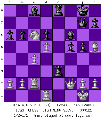 Last move : 1/2-1/2 2011 July 20 20:48:5 [Event "FICGS__CHESS__LIGHTNING_SILVER__000122"] [Site "FICGS"] [Date "2011.07.20"] [Round "1"] [White "Alcala,Alvin"] [Black "Comes,Ruben"] [Result "1/2-1/2"] [WhiteElo "2263"] [BlackElo "2403"] 1.e4 c5 2.Nf3 d6 3.d4 cxd4 4.Nxd4 Nf6 5.Nc3 a6 6.Be3 e5 7.Nb3 Be6 8.Be2 Be7 9.Nd5 Nxd5 10.exd5 Bc8 11.Qd2 O-O 12.O-O Qc7 13.f4 Nd7 14.fxe5 Nxe5 15.Bd4 Re8 16.c4 g6 17.Rac1 b6 18.Qf4 f5 19.Qf2 Rb8 20.Be3 Bf6 21.Nd4 Qg7 22.Rfd1 Rb7 23.Rc2 Rbe7 24.Bf4 g5 25.Bxe5 Rxe5 26.Nc6 Re3 27.Bh5 R8e4 28.Bf3 Re8 29.Bh5 R8e4 30.Bf3 Re8 31.Bh5 1/2-1/2 Sicilian : Najdorf, Byrne (English) attack Kingside Castling by player Black (move 11) Kingside Castling by player White (move 12) This chess game ended in a draw. Follow this game move after move (download)Nonsense was the last thing Fischer was interested in, as far as Chess was concerned. (Elie Agur) Oft bringt ein stiller Zug das Erdbeben. (Richard Reti) Dios mío, Bobby Fischer juega tan simple. (Alexei Suetin) C'est la seule position que je connaisse où les deux camps sont mals. Propos prêtés à V. Anand. 'preceded by its own quotation yields a falsehood' preceded by its own quotation yields a falsehood. (W. V. O. Quine - Set Theory And Its Logic, 1953)
