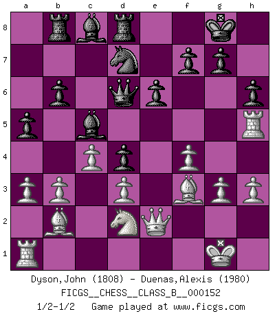 Last move : 1/2-1/2 2011 August 19 22:47:33 [Event "FICGS__CHESS__CLASS_B__000152"] [Site "FICGS"] [Date "2011.07.20"] [Round "1"] [White "Dyson,John"] [Black "Duenas,Alexis"] [Result "1/2-1/2"] [WhiteElo "1808"] [BlackElo "1980"] 1.c4 e6 2.g3 d5 3.Bg2 Nf6 4.Nf3 Be7 5.O-O O-O 6.b3 c5 7.Bb2 Nc6 8.e3 d4 9.exd4 cxd4 10.Re1 Re8 11.a3 a5 12.d3 Bc5 13.Ne5 Nxe5 14.Rxe5 Qd6 15.f4 h6 16.Nd2 Rb8 17.Qe2 Rd8 18.Nf3 b6 19.Nd2 Qe7 20.h3 Nd7 21.Rh5 Qf8 22.Bc6 Qd6 23.Bf3 Nf6 24.Re5 Nd7 25.Rh5 Nf6 26.Re5 Nd7 27.Rh5 1/2-1/2 English Opening Kingside Castling by player White (move 5) Kingside Castling by player Black (move 5) This chess game ended in a draw. Follow this game move after move (download)Bobby Fischer is the greatest Chess genius of all time ! (Alexander Kotov) Ich hatte Zahnschmerzen im ersten Spiel. In der zweiten Partie tat mir der Kopf weh. In der dritten war es eine Rheuma-Attacke und während der vierten fühlte ich mich nicht gut. Und in der fünften? Nun, man muss doch nicht jedes Spiel gewinnen, oder? (Savielly Grigorievitsch Tartakower) El Ajedrez no es una pizca de inferior al violín, y tenemos un gran número de violinistas profesionales. (Mikhail Botvinnik) Ce qui caractérise les parties de combat, c'est que si le défenseur a constamment de difficiles problèmes à résoudre, l'attaquant doit chercher sans relâche de nouvelles possibilités d'attaque. (Koblentz) Industry executives and analysts often mistakenly talk about strategy as if it were some kind of chess match. But in chess, you have just two opponents, each with identical resources, and with luck playing a minimal role. The real world is much more like a poker game, with multiple players trying to make the best of whatever hand fortune has dealt them. In our industry, Bill Gates owns the table until someone proves otherwise. (David Moschella, 'Computerworld')