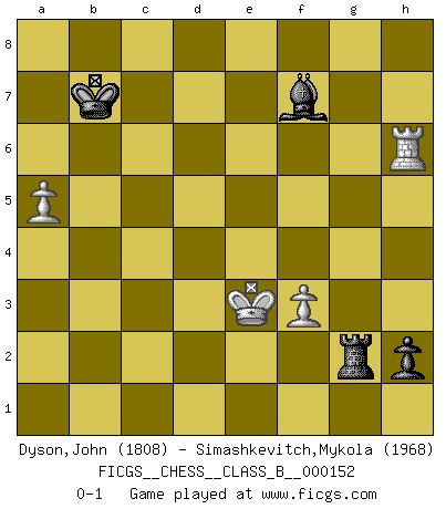 Last move : 0-1 2012 January 17 13:39:13 [Event "FICGS__CHESS__CLASS_B__000152"] [Site "FICGS"] [Date "2011.07.20"] [Round "1"] [White "Dyson,John"] [Black "Simashkevitch,Mykola"] [Result "0-1"] [WhiteElo "1808"] [BlackElo "1968"] 1.c4 e5 2.g3 Nf6 3.Bg2 d5 4.cxd5 Nxd5 5.Nc3 Nb6 6.Nf3 Nc6 7.O-O Be7 8.a3 O-O 9.b4 Be6 10.Rb1 f6 11.d3 Nd4 12.Nd2 c6 13.Nde4 Rf7 14.e3 Nb5 15.Nxb5 cxb5 16.Nc5 Bxc5 17.bxc5 Na4 18.Qc2 Qd7 19.c6 bxc6 20.Bxc6 Qc7 21.Rxb5 Rc8 22.Qxa4 Qxc6 23.Rb4 Qd5 24.Qd1 Rd7 25.e4 Qxd3 26.Qxd3 Rxd3 27.Ra4 Rdc3 28.Be3 a6 29.Rb1 Bc4 30.Ra5 Bd3 31.Rb4 h5 32.Kg2 Kf7 33.h3 Rc2 34.a4 R8c3 35.Kh2 Kg6 36.g4 h4 37.g5 Ra3 38.gxf6 gxf6 39.Rc5 Rxc5 40.Bxc5 a5 41.Rb6 Ra2 42.Rb3 Bxe4 43.Ra3 Rc2 44.Bb6 f5 45.Ra1 Rb2 46.Bc5 f4 47.Kg1 Kf5 48.Kf1 Rb3 49.Ra3 Rb1+ 50.Ke2 Rh1 51.Kd2 Rh2 52.Bb6 Bg2 53.Bxa5 Bxh3 54.Bb6 Bf1 55.a5 Ba6 56.Rb3 e4 57.Rc3 h3 58.Rc6 Rg2 59.Rh6 e3+ 60.Bxe3 fxe3+ 61.Kxe3 h2 62.Rh8 Bb7 63.Rh6 Kg4 64.Rh7 Bc8 65.Rh8 Kf5 66.Kf3 Bb7+ 67.Ke3 Ke5 68.Rh7 Kd5 69.Rh3 Kc5 70.Rh7 Kc6 71.Rh5 Kd6 72.Rh3 Bd5 73.Rh6+ Kc7 74.Rh7+ Kc6 75.Rh6+ Kb7 76.f3 Bf7 0-1 English Opening Kingside Castling by player White (move 7) Kingside Castling by player Black (move 8) 10 pieces endgame at move 60 : White KRBPP , Black KRBPP WHITE : King + 1 Rook 1 Bishop 2 Pawns BLACK : King + 1 Rook 1 Bishop 2 Pawns 9 pieces endgame at move 60 : White KRPP , Black KRBPP WHITE : King + 1 Rook 2 Pawns BLACK : King + 1 Rook 1 Bishop 2 Pawns 8 pieces endgame at move 61 : White KRPP , Black KRBP WHITE : King + 1 Rook 2 Pawns BLACK : King + 1 Rook 1 Bishop 1 Pawn Player Black won this chess game. Follow this game move after move (download)Pawn endings are to Chess what putting is to golf. (Cecil Purdy) Sicherlich können nur Meister einen Stil haben. Daß ein nicht-Meister auch nur ein einziges Mal in seinem Leben eine Partie folgerecht durchführte, habe ich niemals bemerkt. (Emanuel Lasker) Un entendimiento minucioso de las típicas continuaciones de mate hacen de las mas complicadas combinaciones de sacrificio que conducen hacia ellas no solo no dificiles, sino casi un asunto de rutina. (Siegbert Tarrasch) Il (Jacob Murray) ne joue pas pour le bon coup, mais pour le meilleur. (Eloi Relange) A belief is an idea the mind possesses, an idea that possesses the mind. (Robert Oxden Bolton)