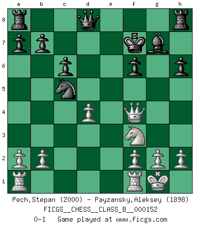Last move : 0-1 2011 November 26 2:12:40 [Event "FICGS__CHESS__CLASS_B__000152"] [Site "FICGS"] [Date "2011.07.20"] [Round "1"] [White "Pech,Stepan"] [Black "Payzansky,Aleksey"] [Result "0-1"] [WhiteElo "2000"] [BlackElo "1898"] 1.d4 Nf6 2.c4 g6 3.Nc3 d5 4.Nf3 Bg7 5.Bg5 Ne4 6.cxd5 Nxg5 7.Nxg5 e6 8.Qd2 exd5 9.Qe3+ Kf8 10.Qf4 f6 11.Nf3 c6 12.e4 dxe4 13.Nxe4 Be6 14.Bd3 h6 15.Nc5 Bf7 16.O-O Na6 17.Bxg6 Nxc5 18.Bxf7 Kxf7 0-1 This chess game has been lost on time (started : 2011.07.20 21:27:47) King's Indian defense, 3.Nc3 Kingside Castling by player White (move 16) Player Black won this chess game. Follow this game move after move (download)My opponents make good moves too. Sometimes I don't take these things into consideration. (Bobby Fischer) Gewöhnliche Menschen denken nur daran, wie sie ihre Zeit verbringen. Ein intelligenter Mensch versucht, sie auszunutzen. (Arthur Schopenhauer) Ayuda a tus piezas para que ellas te puedan ayudar. (Paul Morphy) Le jeu d'échecs fait naître et fortifie en nous plusieurs qualités précieuses dans le cours de l'existence, telles que la prévoyance, la circonspection, la prudence, et la persévérance. (Benjamin Franklin - 1783, la morale des échecs) Nothing is more important for teaching us to understand the concepts we have than constructing fictitious ones. (Ludwig Wittgenstein)