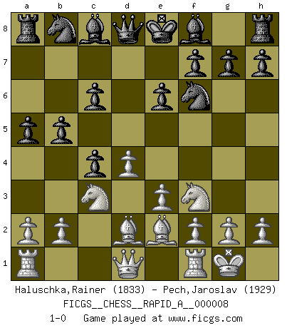 Last move : 1-0 2007 February 21 0:10:51 [Event "FICGS__CHESS__RAPID_A__000008"] [Site "FICGS"] [Date "2006.12.28"] [Round "1"] [White "Haluschka,Rainer"] [Black "Pech,Jaroslav"] [Result "1-0"] [WhiteElo "1833"] [BlackElo "1929"] 1.d4 d5 2.c4 c6 3.Nf3 Nf6 4.Nc3 dxc4 5.e3 b5 6.Bd2 a5 7.Be2 e6 8.O-O 1-0 QGD Slav : 5.e3 (Alekhine variation) Kingside Castling by player White (move 8) Player White won this chess game. Follow this game move after move (download)Though most people love to look at the games of the great attacking masters, some of the most successful players in history have been the quiet positional players. They slowly grind you down by taking away your space, tying up your pieces, and leaving you with virtually nothing to do ! (Yasser Seirawan) Nicht daß Diemer aus Opportunismus Mitglied der NSDAP geworden wäre. Er war ein Fanatiker, in allem, was er tat. (Hans Ree) El Ajedrez es en su esencia, un juego. En su forma, un arte. Y en su ejecución, una ciencia. (Baron Tassilo) Comme les marins qui ont mille raisons différentes d'aller en mer, les joueurs d'échecs en ont tout autant avant de s'installer devant une table et jouer... (Vincent Bertignac, philosophe) A married woman is like a fish riding a bicycle. (Rodolfo d'Ettorre)