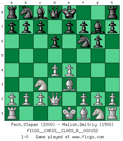 Last move : 1-0 2011 October 11 11:45:58 [Event "FICGS__CHESS__CLASS_B__000152"] [Site "FICGS"] [Date "2011.07.20"] [Round "1"] [White "Pech,Stepan"] [Black "Malish,Dmitriy"] [Result "1-0"] [WhiteElo "2000"] [BlackElo "1900"] 1.e4 d6 2.d4 g6 3.Nc3 Bg7 4.Be3 Nf6 5.Qd2 1-0 This chess game has been lost on time (started : 2011.07.20 21:27:47) King's pawn Opening Player White won this chess game. Follow this game move after move (download)In Chess, as it is played by masters, chance is practically eliminated. (Emanuel Lasker) Privat ist Kortschnoi kein schlechter Mensch, sehr sympathisch. Aber während des Spiels ist er grausam. Er will dich töten. (Miguel Najdorf) Una victoria por una combinación errónea, aunque sea espectacular, me llena de horror artístico. (Wilhelm Steinitz) Aux échecs, l'amour-propre est satisfait quand on remporte la victoire, mais il n'y a pas de honte à être battu. (Benjamin Franklin) Yoga is 99% practice and 1% knowledge. (Sri Krishna Pattabhi Jois)