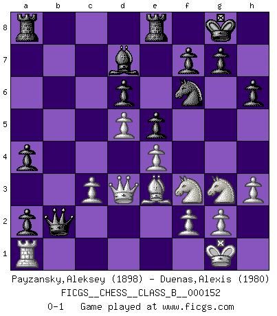 Last move : 0-1 2011 July 26 16:27:34 [Event "FICGS__CHESS__CLASS_B__000152"] [Site "FICGS"] [Date "2011.07.20"] [Round "1"] [White "Payzansky,Aleksey"] [Black "Duenas,Alexis"] [Result "0-1"] [WhiteElo "1898"] [BlackElo "1980"] 1.e4 e5 2.Nf3 Nc6 3.Bb5 a6 4.Ba4 Nf6 5.O-O Be7 6.Re1 b5 7.Bb3 d6 8.c3 O-O 9.h3 Na5 10.Bc2 c5 11.d4 Qc7 12.Nbd2 cxd4 13.cxd4 Nc6 14.Nb3 a5 15.Be3 a4 16.Nbd2 Bd7 17.Rc1 Qb7 18.Bb1 h6 19.Nf1 Rfe8 20.Ng3 Bd8 21.Qe2 Bb6 22.d5 Ne7 23.Bd3 Ng6 24.Rc2 Nf4 25.Qd2 Ba5 26.Rc3 b4 27.R3c1 b3 28.Rc3 Bxc3 29.bxc3 Nxd3 30.Qxd3 bxa2 31.Ra1 Qb2 0-1 Ruy Lopez : Closed Kingside Castling by player White (move 5) Kingside Castling by player Black (move 8) Player Black won this chess game. Follow this game move after move (download)The isolated Pawn casts gloom over the entire chessboard. (Aaron Nimzovich) Ich kämpfe solange mein Gegner einen Fehler machen kann. (Emanuel Lasker) Fischer era un maestro de claridad y un Rey del posicionamiento astuto. Sus oponentes podían ver hacia donde se dirigía pero eran impotentes para detenerlo. (Bruce Pandolfini) Le plus grand jeu de l'esprit jamais inventé, plus vous l'apprenez, plus vous y prenez du plaisir. (Garry Kasparov) Those who make the worst use of their time are the first to complain of its brevity. (Jean de la Bruyere)