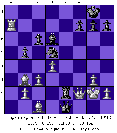 Last move : 0-1 2011 September 14 6:34:31 [Event "FICGS__CHESS__CLASS_B__000152"] [Site "FICGS"] [Date "2011.07.20"] [Round "1"] [White "Payzansky,Aleksey"] [Black "Simashkevitch,Mykola"] [Result "0-1"] [WhiteElo "1898"] [BlackElo "1968"] 1.e4 e5 2.Nf3 Nc6 3.Bb5 a6 4.Ba4 Nf6 5.O-O Be7 6.Re1 b5 7.Bb3 O-O 8.c3 d5 9.exd5 Nxd5 10.Nxe5 Nxe5 11.Rxe5 c6 12.d4 Bd6 13.Re1 Qh4 14.g3 Qh3 15.Qe2 Bg4 16.Qf1 Qh5 17.Nd2 Rae8 18.Rxe8 Rxe8 19.f3 Bh3 20.Qf2 Bf5 21.a4 Qg6 22.Ne4 Bxe4 23.fxe4 Qxe4 24.axb5 axb5 25.Ra7 Qe1+ 26.Kg2 Re2 0-1 Ruy Lopez : Closed, 7...O-O Kingside Castling by player White (move 5) Kingside Castling by player Black (move 7) Player Black won this chess game. Follow this game move after move (download)Fischer wanted to give the Russians a taste of their own medicine. (Larry Evans) Verschiedene, sehr schätzbare und im Laufe des Lebens nützliche Eigenschaften des Geistes können durch das Schachspiel erworben und gekräftigt werden, so dass sie zu Gewohnheiten werden, die uns nie im Stich lassen. (Benjamin Franklin) Algunos sacrificios son sólidos, los demás son míos. (Mikhail Tal) Les échecs sont utiles à l'exercice de la faculté de penser et à celle de l'imagination. Car nous devons posséder une méthode élaborée pour atteindre des buts partout où nous devons conduire notre raison. (Leibnitz) Luck never gives; it only lends. (Swedish proverb)