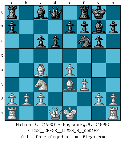 Last move : 0-1 2011 August 31 22:13:19 [Event "FICGS__CHESS__CLASS_B__000152"] [Site "FICGS"] [Date "2011.07.20"] [Round "1"] [White "Malish,Dmitriy"] [Black "Payzansky,Aleksey"] [Result "0-1"] [WhiteElo "1900"] [BlackElo "1898"] 1.e4 c5 2.Nf3 d6 3.d4 cxd4 4.Nxd4 Nf6 5.Nc3 g6 6.Be3 Bg7 7.f3 O-O 8.Bc4 Nc6 9.Nxc6 bxc6 0-1 This chess game has been lost on time (started : 2011.07.20 21:27:47) Sicilian : Dragon, Yugoslav attack, 7...O-O Kingside Castling by player Black (move 7) Player Black won this chess game. Follow this game move after move (download)Good offense and good defense both begin with good development. (Bruce A. Moon) Schach ist ein Kampf gegen den Fehler. (Johannes Herrman Zukertort) Botvinnik trató de alejar el misterio referente al Ajedrez, siempre relacionandolo a situaciones de la vida diaria. Solía llamar al Ajedrez un problema inexacto típico, similar a aquellos en que la gente tiene siempre que resolver a cada día. (Garry Kasparov) Une platitude souvent récitée à propos des Echecs est qu'une des choses les plus difficiles à réaliser est de gagner une position gagnante. Cela ne manque pas de sens mais, pour ma part, j'ai toujours trouvé plus difficile de gagner une position perdante. (Tim Krabbe) Luck has a peculiar habit of favoring those who don't depend on it. (Author unknown)
