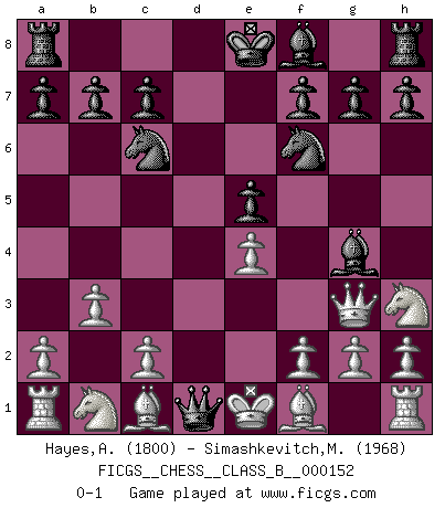 Last move : 0-1 2011 July 22 12:6:42 [Event "FICGS__CHESS__CLASS_B__000152"] [Site "FICGS"] [Date "2011.07.20"] [Round "1"] [White "Hayes,Alexander"] [Black "Simashkevitch,Mykola"] [Result "0-1"] [WhiteElo "1800"] [BlackElo "1968"] 1.e4 e5 2.b3 Nf6 3.d3 d5 4.Qf3 Nc6 5.Nh3 dxe4 6.dxe4 Bg4 7.Qg3 Qd1+ 0-1 King's pawn game Player Black won this chess game. Follow this game move after move (download)Many have become Chess Masters, no one has become the Master of Chess. (Siegbert Tarrasch) Ein Remis kann durch Wiederholung von drei Zügen oder durch einen schlechte Zug erreicht werden. (Savielly Grigorievitsch Tartakower) En la perfecta combinación de Ajedrez como en una historia corta de primera clase, toda la trama y contra trama deberá conducir hacia un final sorprendente, el interes no es mitigado hasta el último momento. (Yates and Winter) D'abord les bases : Jouez et étudiez, puis étudiez et jouez, ensuite jouez et étudiez, puis étudiez et jouez. Deuxièmement : Donnez toujours le meilleur de vous-même ! (Ken Smith) Computers are like Old Testament gods; lots of rules and no mercy. (Joseph Campbell)
