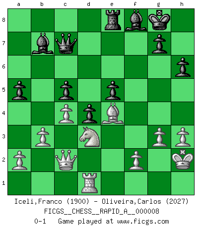 Last move : 0-1 2007 April 11 10:43:10 [Event "FICGS__CHESS__RAPID_A__000008"] [Site "FICGS"] [Date "2006.12.28"] [Round "1"] [White "Iceli,Franco"] [Black "Oliveira,Carlos"] [Result "0-1"] [WhiteElo "1900"] [BlackElo "2027"] 1.e4 c6 2.d4 d6 3.c4 Qc7 4.Nc3 e5 5.d5 Be7 6.Nf3 Nf6 7.Be2 Nbd7 8.O-O O-O 9.h3 a5 10.Ng5 h6 11.Nf3 Nc5 12.Qc2 Re8 13.b3 Bf8 14.Be3 Nh5 15.Bxc5 dxc5 16.dxc6 bxc6 17.Rfe1 Nf4 18.Bf1 Be6 19.Rad1 Rad8 20.Kh2 Rxd1 21.Rxd1 Bc8 22.g3 Ne6 23.Ne2 Nd4 24.Nfxd4 cxd4 25.Nc1 c5 26.Nd3 f5 27.Bg2 fxe4 28.Bxe4 Bb7 0-1 This chess game has been lost on time (started : 2006.12.28 1:16:19) Caro-Kann defense Kingside Castling by player White (move 8) Kingside Castling by player Black (move 8) Player Black won this chess game. Follow this game move after move (download)We like to think. (Gary Kasparov) Schach ist das schnellste Spiel der Welt, weil man in jeder Sekunde Tausende von Gedanken ordnen muß. (Albert Einstein) Un jugador que trata de regresar una movida en el Ajedrez es un futuro carterista. (Richard Fenton) C'est une question de caractère, Beaucoup de gens perdent leur motivation très vite. D'autres, ils sont rares, peuvent la conserver très longtemps. J'aime les échecs, encore aujourd'hui je suis heureux d'analyser des parties. J'aime toujours gagner, je déteste encore perdre. Bien jouer est important pour mon intégrité intellectuelle et morale. Et puis les échecs vivent en ce moment une période historique grâce à Internet. Ils se développent dans les systèmes éducatifs à travers le monde. Ils sortent de leur ghetto, et c'est mon rôle de mener à bien cette révolution. (Gary Kasparov) There's no money in correspondence chess. (John Knudsen)