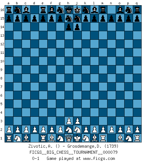 Last move : 0-1 2011 August 20 21:53:8 [Event "FICGS__BIG_CHESS__TOURNAMENT__000079"] [Site "FICGS"] [Date "2011.07.21"] [Round "1"] [White "Zivotic,Aleksandar"] [Black "Grosdemange,David"] [Result "0-1"] [WhiteElo ""] [BlackElo "1739"] 0-1 This big chess game has been lost on time (started : 2011.07.21 12:39:30) Follow this game move after move (download)There are two classes of men; those who are content to yield to circumstances and who play whist; those who aim to control circumstances, and who play Chess. (Mortimer Collins) Woher wissen wir, daß der Neanderthaler Blindschach gespielt hat? -- Bei Ausgrabungen wurden keine Schachbretter und Figuren gefunden. (Anonymous) Una buena ofensiva y una buena defensa, comienzan ambas con un buen desarrollo. (Bruce A. Moon) Le génie consiste à savoir transgresser les règles au moment opportun. (Teichmann) Perception is reality. (Immanuel Kant)