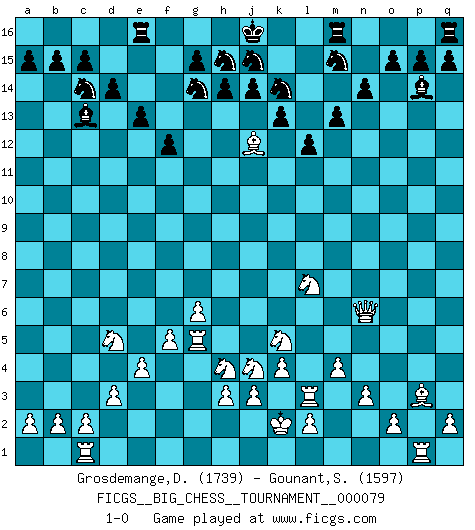Last move : 1-0 2011 September 6 3:36:23 [Event "FICGS__BIG_CHESS__TOURNAMENT__000079"] [Site "FICGS"] [Date "2011.07.21"] [Round "1"] [White "Grosdemange,David"] [Black "Gounant,Stanislas"] [Result "1-0"] [WhiteElo "1739"] [BlackElo "1597"] 1.j2-h4 j15-g14 2.b1-c3 m15-m13 3.e2-e4 l16-o13 4.m2-m4 n15-n14 5.f1-b5 o16-l13 6.d2-d3 p16-o14 7.p1-o3 e15-e13 8.g1-f3 f16-c13 9.k1-l3 d15-d14 10.l1-p5 c16-k9 11.n2-n3 b16-c14 12.g2-g4 f15-f13 13.f3-g5 l13-n11 14.g5-j6 n11-c1 15.a1-c1 h16-n11 16.g4-g5 f13-f12 17.f2-f4 g16-j15 18.f4-f5 l15-l13 19.e1-g1 l13-l12 20.l3-k5 n11-p11 21.j6-l7 k9-o5 22.o1-m3 o5-m3 23.m1-m3 k15-k13 24.h1-n6 a16-d16 25.p5-d16 p11-p2 26.q1-p1 p2-o3 27.d16-q4 o3-n2 28.m3-l3 c13-b12 29.k2-k4 n2-q5 30.q4-p3 b12-c13 31.j1-k2 o13-p14 32.h2-j4 h15-k14 33.c3-d5 k16-h15 34.g5-g6 o14-m15 35.g1-g5 q5-j12 36.b5-j12 1-0 Follow this game move after move (download)The boy (then a 12 year old boy named Anatoly Karpov) doesn't have a clue about Chess, and there's no future at all for him in this profession. (Mikhail Botvinnik) Es gibt Leute, die glauben, alles wäre vernünftig, was man mit einem ernsthaften Gesicht tut. (Georg Christoph Lichtenberg) El sobresalir en el Ajedrez es un signo de una mente intrigante. (Sir Arthur Conan Doyle) Toutes choses étant égales, c'est la conviction qui gagne. Alliée à une volonté de vaincre, elle sert de détonateur, suscite des idées, disperse les doutes et aide à penser clairement. (Robert Fischer) Looking at the proliferation of personal web pages on the Net, it looks like very soon everyone on Earth will have 15 megabytes of fame. (M.G. Sriram)