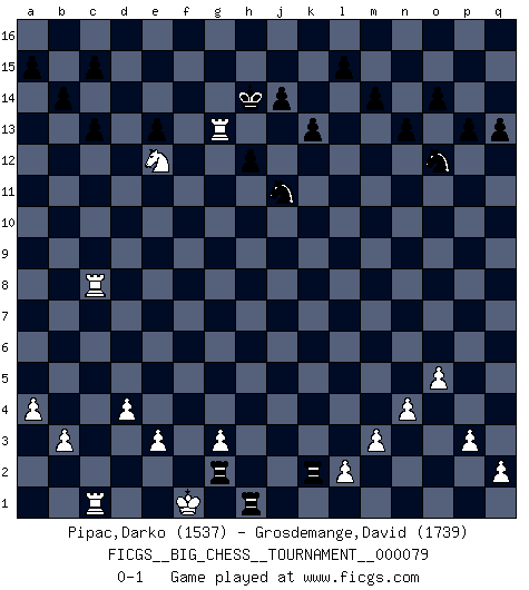 Last move : 0-1 2011 October 2 21:20:10 [Event "FICGS__BIG_CHESS__TOURNAMENT__000079"] [Site "FICGS"] [Date "2011.07.21"] [Round "1"] [White "Pipac,Darko"] [Black "Grosdemange,David"] [Result "0-1"] [WhiteElo "1537"] [BlackElo "1739"] 1.j2-k4 j15-h13 2.h2-g4 h16-k14 3.p2-p3 b16-c14 4.e2-e3 k14-c7 5.g2-g3 c7-c2 6.b1-c3 c2-p14 7.h1-e4 p16-o14 8.f1-d3 g16-f14 9.e4-d5 p14-p11 10.d5-j5 p11-j5 11.g4-j5 e15-e13 12.o1-q3 f16-c13 13.n2-n3 d15-d14 14.b2-b3 k16-l14 15.c1-a3 n15-n13 16.a3-o16 q16-o16 17.c3-e4 m15-m14 18.a1-c1 l16-o13 19.m2-m3 l14-k12 20.o2-o4 c16-k9 21.q3-k9 o13-k9 22.n3-n4 h15-g13 23.o4-o5 c14-d12 24.l1-n3 d12-e14 25.n3-c13 d14-c13 26.e4-c5 k9-d3 27.c5-d3 e16-d16 28.c1-c3 d16-d11 29.g1-f3 a16-d16 30.d3-e5 b15-b14 31.p1-o3 j16-h15 32.k1-l3 d16-d12 33.j1-h2 m16-d16 34.d2-d4 f14-g12 35.o3-n5 e14-f12 36.j5-l6 g13-h11 37.l3-m5 g12-f10 38.n5-m7 o14-m13 39.m5-l7 f12-g10 40.k4-j6 h13-j11 41.e1-c1 o15-o14 42.l6-k8 p15-p13 43.m7-l9 h11-j9 44.l7-j8 h14-h13 45.l9-j10 k12-j10 46.k8-j10 g15-g13 47.e5-f7 j11-h9 48.j6-h8 g10-h8 49.f7-h8 h13-h12 50.j8-h10 k15-k13 51.h8-k9 f10-g12 52.c3-c9 g12-h10 53.c9-h9 h10-k9 54.h9-j9 k9-j11 55.f3-g5 d11-d9 56.j9-j7 d12-a12 57.a2-a4 d16-d10 58.g5-e6 q15-q13 59.c1-c8 a12-a10 60.m1-c1 d10-j10 61.j7-g7 f15-f14 62.e6-d8 o16-d16 63.d8-c6 m13-o12 64.c6-b8 a10-f10 65.b8-d9 f10-f2 66.h2-g1 f2-k2 67.d9-c11 j10-j3 68.c11-e12 d16-d9 69.e12-f14 h15-g14 70.f14-e12 d9-j9 71.g7-g13 g14-h14 72.g1-h1 j3-h3 73.h1-g1 j9-j2 74.q1-h1 j2-g2 75.g1-f1 h3-h1 0-1 Follow this game move after move (download)Chess is a matter of delicate judgment, knowing when to punch and how to duck. (Bobby Fischer) Ein Gewinn durch eine ungenaue Kombination, sei sie auch noch so vorzeigbar, erfüllt mich mit Schaudern. (Wilhelm Steinitz) El ganar no lo es todo... pero el perder es nada. (Mednis) Le jeu d'échecs fait naître et fortifie en nous plusieurs qualités précieuses dans le cours de l'existence, telles que la prévoyance, la circonspection, la prudence, et la persévérance. (Benjamin Franklin - 1783, la morale des échecs) When you stop learning you start dying. (Scott Adams)
