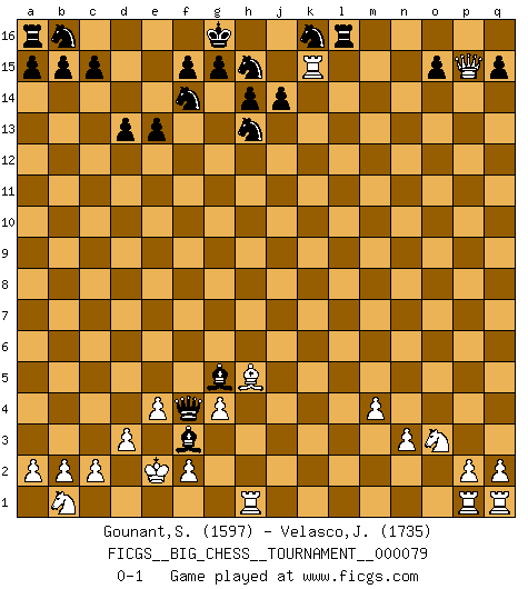 Last move : 0-1 2011 July 27 13:12:14 [Event "FICGS__BIG_CHESS__TOURNAMENT__000079"] [Site "FICGS"] [Date "2011.07.21"] [Round "1"] [White "Gounant,Stanislas"] [Black "Velasco,Jose Maria"] [Result "0-1"] [WhiteElo "1597"] [BlackElo "1735"] 1.j2-g3 p16-o14 2.e2-e4 j15-h13 3.d2-d3 h16-o10 4.p1-o3 m15-m13 5.c1-e3 l16-q11 6.b1-c3 n15-n13 7.f1-e2 o16-g9 8.m2-m4 e15-e13 9.l1-p5 f16-c13 10.n2-n3 d15-d13 11.o1-j6 c16-m7 12.p5-l9 m13-m12 13.h1-m5 m7-l6 14.m5-m8 o10-b10 15.e1-b1 g9-k6 16.m8-k8 m16-m14 17.k8-g5 b10-p10 18.m1-p1 m14-k14 19.h2-k3 p10-p6 20.k3-j5 p6-l2 21.j5-l6 k6-g3 22.g5-g3 l2-k2 23.j1-h1 q11-l6 24.g3-j1 l6-m5 25.g1-j2 k2-o2 26.k1-l3 m5-q9 27.l3-m1 o2-l2 28.e2-h5 l2-q7 29.h1-h2 e16-e14 30.j2-k4 c13-b12 31.j1-k1 q7-c7 32.e3-f4 c7-c5 33.k1-e1 e14-g14 34.g2-g4 c5-e7 35.f4-g5 g14-g5 36.l9-g5 e7-g5 37.e1-e3 g5-c9 38.m1-l3 k14-k4 39.j3-k4 b12-k4 40.h2-g3 k4-j5 41.g3-f3 j5-l3 42.f3-e2 l3-k2 43.j6-o11 q9-o7 44.b1-k1 n13-n12 45.o11-p10 k2-g5 46.e3-g3 g5-h4 47.g3-f4 g16-f14 48.f4-o12 c9-f6 49.a1-f1 h4-g5 50.o12-l15 f6-f4 51.l15-k15 j16-h16 52.p10-n12 f4-d2 53.e2-f3 o14-n12 54.k15-n12 o7-j2 55.n12-m12 h16-g16 56.m12-p15 q16-l16 57.k1-k15 j2-h3 58.f1-h1 d2-f4 59.f3-e2 h3-g2 60.c3-b1 g2-f3 0-1 Follow this game move after move (download)What would Chess be without silly mistakes ? (Kurt Richter) Alle offensichtlichen Züge sehen nach dem Spiel in der Analyse verdächtig aus. (Viktor Kortschnoi) Un mal plan es mejor que no tener ningún plan. (Frank Marshall) Le joueur d'Echecs qui veut atteindre le top est obligé de développer son propre credo créatif. Alexeï Stepanovicth Souétine. Il est facile d'écrire des livres ! Ce qui est difficile, c'est de jouer ! (Alexeï Stepanovicth Souétine) A government big enough to give you everything you want is strong enough to take everything you have. (Thomas Jefferson)