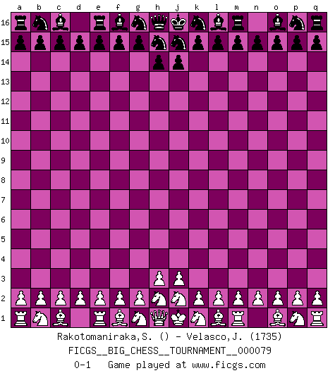 Last move : 0-1 2011 August 20 21:53:8 [Event "FICGS__BIG_CHESS__TOURNAMENT__000079"] [Site "FICGS"] [Date "2011.07.21"] [Round "1"] [White "Rakotomaniraka,Sandro"] [Black "Velasco,Jose Maria"] [Result "0-1"] [WhiteElo ""] [BlackElo "1735"] 0-1 This big chess game has been lost on time (started : 2011.07.21 12:39:30) Follow this game move after move (download)There must have been a time when men were demigods, or they could not have invented Chess. (Gustav Schenk) Nicht daß Diemer aus Opportunismus Mitglied der NSDAP geworden wäre. Er war ein Fanatiker, in allem, was er tat. (Hans Ree) La mitad de las variaciones que son calculadas en una partida de torneo, resultan ser completamente superfluas. Desafortunadamente, nadie sabe por adelantado cual mitad. (Jan Tinman) Les échecs sont un jeu terrible. Si vous n'avez pas le centre, votre adversaire a une position plus libre. Par contre, si vous avez le centre, alors vous avez vraiment quelque chose pour laquelle vous inquiéter ! (Siegbert Tarrasch) If things go wrong, don't go with them. (Roger Babson)