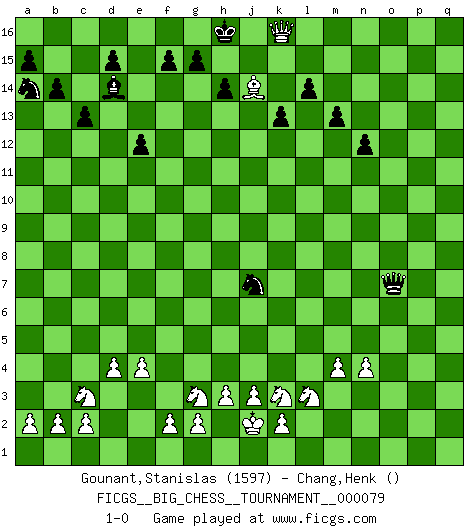 Last move : 1-0 2011 September 6 18:17:15 [Event "FICGS__BIG_CHESS__TOURNAMENT__000079"] [Site "FICGS"] [Date "2011.07.21"] [Round "1"] [White "Gounant,Stanislas"] [Black "Chang,Henk"] [Result "1-0"] [WhiteElo "1597"] [BlackElo ""] 1.j2-g3 p15-p14 2.e2-e4 h15-g13 3.f1-c4 n15-n14 4.d2-d3 p16-o14 5.c1-g5 o16-p15 6.b1-c3 k15-k13 7.m2-m4 l16-k15 8.l1-o4 b16-a14 9.n2-n3 e15-e13 10.o1-g8 f16-d14 11.h1-m5 c15-c14 12.p1-n2 b15-b14 13.g1-j2 c16-b15 14.o4-j9 a16-b16 15.g5-f6 c14-c13 16.m5-o5 o14-q13 17.j9-p15 q13-p15 18.f6-p15 q16-p16 19.o5-o15 k15-n12 20.p15-q14 n12-o13 21.q14-e3 j15-l14 22.o15-q15 p16-q16 23.q15-p15 n14-n13 24.p15-o14 q16-q13 25.g8-j6 q13-q16 26.o14-p13 m15-m14 27.j6-g8 k16-m15 28.g8-n14 q16-q13 29.p13-p10 j16-k15 30.n14-o13 q13-o13 31.p10-p14 m16-o16 32.n2-p3 o13-o2 33.m1-o1 b15-p2 34.o1-o2 o16-o2 35.q1-l1 h16-q8 36.p3-q1 p2-q1 37.l1-q1 o2-l2 38.j2-l3 l2-q2 39.q1-q2 q8-q2 40.h2-j4 e13-e12 41.j1-j2 g16-j15 42.k1-h2 e16-o16 43.e1-q1 q2-m6 44.a1-o1 m14-m13 45.o1-o16 b16-o16 46.p14-p15 l14-k16 47.q1-q16 o16-q16 48.p15-q16 l15-l14 49.q16-p15 k15-j16 50.p15-n15 n13-n12 51.h2-k3 m6-n6 52.n3-n4 g13-h11 53.n15-m16 h11-j9 54.e3-o12 j9-k7 55.d3-d4 n6-o7 56.o12-l15 k7-j5 57.j4-l5 j5-k3 58.l5-k3 j15-h13 59.c4-a6 h13-j11 60.a6-j14 j11-k9 61.m16-l16 k9-j7 62.l16-k15 j16-h16 63.l15-k16 m15-k16 64.k15-k16 1-0 Follow this game move after move (download)Only the player with the initiative has the right to attack. (Wilhelm Steinitz) Gewöhnliche Menschen denken nur daran, wie sie ihre Zeit verbringen. Ein intelligenter Mensch versucht, sie auszunutzen. (Arthur Schopenhauer) Siempre es mejor sacrificar los hombres de tu oponente. (Savielly Tartakower) Celui qui prend des risques peut perdre, celui qui n'en prend pas perd toujours. (Xavier Tartacover) All maxims have their antagonist maxims; proverbs should be sold in pairs, a single one being but a half truth. (William Mathews)