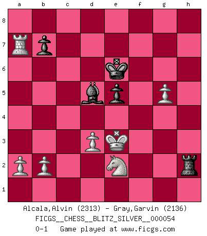 Last move : 0-1 2011 July 25 20:56:54 [Event "FICGS__CHESS__BLITZ_SILVER__000054"] [Site "FICGS"] [Date "2011.07.25"] [Round "1"] [White "Alcala,Alvin"] [Black "Gray,Garvin"] [Result "0-1"] [WhiteElo "2313"] [BlackElo "2136"] 1.e4 e6 2.d4 d5 3.Nc3 Nf6 4.e5 Nfd7 5.f4 c5 6.Nf3 Nc6 7.Be3 cxd4 8.Nxd4 Bc5 9.Qd2 Nxd4 10.Bxd4 Bxd4 11.Qxd4 Qb6 12.Qxb6 Nxb6 13.Nb5 Ke7 14.Bd3 Bd7 15.Nd4 Na4 16.O-O-O Nc5 17.Kd2 g5 18.fxg5 Rag8 19.h4 h6 20.g4 hxg5 21.h5 Rf8 22.Rdf1 Nxd3 23.cxd3 f6 24.exf6+ Rxf6 25.Nf3 Rhf8 26.h6 Rh8 27.Ne5 Rxf1 28.Rxf1 Be8 29.Rh1 d4 30.Nf3 Bc6 31.Ke2 Kf6 32.Rh5 Be8 33.Rxg5 Rxh6 34.Ra5 Rh7 35.Rxa7 Bc6 36.Nxd4 Rh2+ 37.Ke3 Bd5 38.Ne2 e5 39.g5+ Ke6 0-1 French : Steinitz, Boleslavsky variation Queenside Castling by player White (move 16) Player Black won this chess game. Follow this game move after move (download)The passed Pawn is a criminal, who should be kept under lock and key. Mild measures, such as police surveillance, are not sufficient. (Aaron Nimzovich) Die Idee von Capablanca, Schach als Fach in den Schulen zu lehren, ist großartig. (Fidel Castro) Yo creo que el Ajedrez posee una magia que es también una ayuda en la edad avanzada. Una rodilla reumática es olvidada durante una partida de Ajedrez y otros eventos pueden parecer algo sin importancia comparada a una catástrofe en el tablero de Ajedrez. (Vlastimil Hort) Le joueur d'Echecs qui veut atteindre le top est obligé de développer son propre credo créatif. Alexeï Stepanovicth Souétine. Il est facile d'écrire des livres ! Ce qui est difficile, c'est de jouer ! (Alexeï Stepanovicth Souétine) In fact if nothing is done against this teddy bear, hereby I announce that I would quit chess, rapid chess, blitz chess, postal chess, email chess, server chess and correspondence chess I will then switch to a table game where teddy bears aren't going to be seen for a while, like Poker, or Roulette, all 18+ games. (Elmer Valderrama)