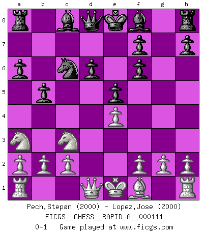 Last move : 0-1 2011 September 12 9:21:24 [Event "FICGS__CHESS__RAPID_A__000111"] [Site "FICGS"] [Date "2011.07.25"] [Round "1"] [White "Pech,Stepan"] [Black "Lopez,Jose"] [Result "0-1"] [WhiteElo "2000"] [BlackElo "2000"] 1.e4 c5 2.Nf3 Nc6 3.d4 cxd4 4.Nxd4 Nf6 5.Nc3 e5 6.Ndb5 d6 7.Bg5 a6 8.Na3 b5 9.Bxf6 gxf6 0-1 Sicilian : Pelikan (Lasker/Sveshnikov) variation Player Black won this chess game. Follow this game move after move (download)A strong memory, concentration, imagination, and a strong will is required to become a great Chess player. (Bobby Fischer) Vielleicht wirkt die Aura früherer Spieler glanzvoller als die der heutigen Spieler, aber das liegt daran, dass man kein Programm wie Fritz hatte, das einem all die Löcher in ihren Partien zeigt. (Vladimir Kramnik) Uno por uno, yo los acribillé, mi superioridad muy pronto se volvio aparente. (Jose Capablanca) Les erreurs sont comme les malheurs, elles n'arrivent jamais seules. (Siegbert Tarrasch) Optimism is a variety of information deficit. Sometimes especially true for correspondence chess games. (Michael Aigner)