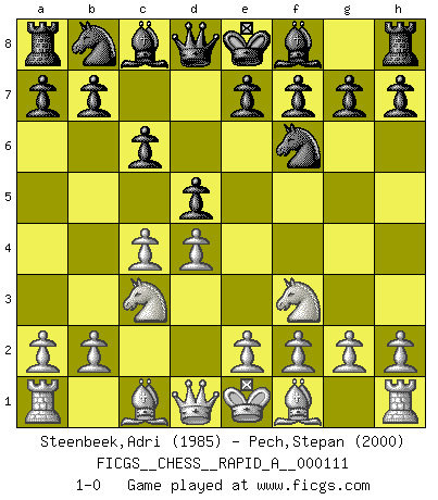 Last move : 1-0 2011 August 28 22:3:52 [Event "FICGS__CHESS__RAPID_A__000111"] [Site "FICGS"] [Date "2011.07.25"] [Round "1"] [White "Steenbeek,Adri"] [Black "Pech,Stepan"] [Result "1-0"] [WhiteElo "1985"] [BlackElo "2000"] 1.d4 d5 2.c4 c6 3.Nc3 Nf6 4.Nf3 1-0 This chess game has been lost on time (started : 2011.07.25 20:7:28) QGD Slav defense Player White won this chess game. Follow this game move after move (download)I have added these principles to the law: get the Knights into action before both Bishops are developed. (Emanuel Lasker) Man braucht nicht immer den besten Zug zu spielen: Ein Zug muß aktiv, unternehmungslustig, korrekt und schön sein. (David Bronstein) No todos los artistas son jugadores de Ajedrez, pero todos los jugadores de Ajedrez son artistas. (Marcel Duchamp) Les échecs sont un jeu terrible. Si vous n'avez pas le centre, votre adversaire a une position plus libre. Par contre, si vous avez le centre, alors vous avez vraiment quelque chose pour laquelle vous inquiéter ! (Siegbert Tarrasch) For peace of mind, resign as general manager of the universe. (Douglas Adams)