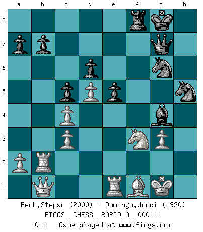 Last move : 0-1 2011 November 12 12:42:0 [Event "FICGS__CHESS__RAPID_A__000111"] [Site "FICGS"] [Date "2011.07.25"] [Round "1"] [White "Pech,Stepan"] [Black "Domingo,Jordi"] [Result "0-1"] [WhiteElo "2000"] [BlackElo "1920"] 1.e4 h6 2.d4 c5 3.d5 d6 4.c4 g5 5.Nc3 Bg7 6.Be2 Bxc3+ 7.bxc3 Qa5 8.Qc2 Nf6 9.Rb1 Nbd7 10.h3 Ne5 11.Nf3 Ng6 12.Bd3 Qc7 13.O-O e5 14.Re1 Nh5 15.Bf1 O-O 16.Qd1 Nhf4 17.h4 gxh4 18.g3 hxg3 19.fxg3 f5 20.exf5 Bxf5 21.Rb2 Nh5 22.Bxh6 Bg4 23.Bxf8 Rxf8 24.Qb1 Qg7 0-1 This chess game has been lost on time (started : 2011.07.25 20:7:28) Carr's defense Kingside Castling by player White (move 13) Kingside Castling by player Black (move 15) Player Black won this chess game. Follow this game move after move (download)We must make sure that Chess will not be like a dead language, very interesting, but for a very small group. (Sytze Faber) Eine Person mit durchschnittlichem IQ kann etwa eine ELO von 2000 erreichen. (Jonathan Levitt) En un gambito tu regalas un Peón por el bién de tomar un juego perdido. (Samuel Standige Boden) Demandez au pauvre Cg1 ce qu'il en pense. Eduard Gufeld à propos de la variante Saemisch de l'Est-Indienne. Thibault, I ask for draw. Game 13876. - Sorry Ilmars, you won. (FICGS chat)