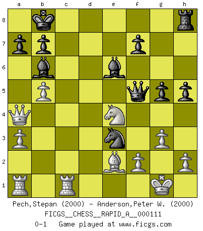 Last move : 0-1 2011 November 3 12:29:48 [Event "FICGS__CHESS__RAPID_A__000111"] [Site "FICGS"] [Date "2011.07.25"] [Round "1"] [White "Pech,Stepan"] [Black "Anderson,Peter W."] [Result "0-1"] [WhiteElo "2000"] [BlackElo "2000"] 1.d4 d5 2.c4 e6 3.Nc3 c5 4.cxd5 cxd4 5.Qa4+ Bd7 6.Qxd4 exd5 7.Qxd5 Nc6 8.Nf3 Nf6 9.Qd1 Bc5 10.e3 Qe7 11.Be2 O-O-O 12.O-O g5 13.Nd4 Kb8 14.a3 h5 15.b4 Bb6 16.Nxc6+ Bxc6 17.Qb3 Ng4 18.b5 Bd7 19.Bb2 Be6 20.Qa4 Qc7 21.g3 Nxe3 22.Rfc1 Qc5 23.Ne4 Qf5 24.Bxh8 Rxh8 0-1 This chess game has been lost on time (started : 2011.07.25 20:7:28) QGD : Tarrasch, von Hennig-Schara gambit Queenside Castling by player Black (move 11) Kingside Castling by player White (move 12) Player Black won this chess game. Follow this game move after move (download)A good sacrifice is one that is not necessarily sound but leaves your opponent dazed and confused. (Rudolph Spielmann) Bis jetzt ist Weiß einer wohlbekannten Analyse gefolgt. Aber jetzt begeht er einen schrecklichen Fehler: Er beginnt seinen eigenen Kopf zu benutzen. (Siegbert Tarrasch) El Ajedrez es el arte del análisis. (Mikhail Botvinnik) Les échecs sont utiles à l'exercice de la faculté de penser et à celle de l'imagination. Car nous devons posséder une méthode élaborée pour atteindre des buts partout où nous devons conduire notre raison. (Leibnitz) There is no vagueness without wind. (Chinese proverb)