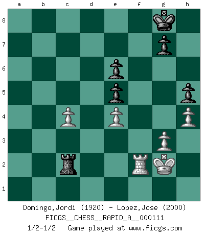 Last move : 1/2-1/2 2011 October 25 7:46:49 [Event "FICGS__CHESS__RAPID_A__000111"] [Site "FICGS"] [Date "2011.07.25"] [Round "1"] [White "Domingo,Jordi"] [Black "Lopez,Jose"] [Result "1/2-1/2"] [WhiteElo "1920"] [BlackElo "2000"] 1.e4 c5 2.Nf3 Nc6 3.d4 cxd4 4.Nxd4 Nf6 5.Nc3 e5 6.Ndb5 d6 7.Bg5 a6 8.Na3 b5 9.Nd5 Be7 10.Bxf6 Bxf6 11.c4 b4 12.Nc2 a5 13.g3 O-O 14.h4 Be6 15.Bh3 a4 16.Bxe6 fxe6 17.Ndxb4 Nxb4 18.Nxb4 Qb6 19.Qd2 Rac8 20.Rc1 Qb7 21.O-O Be7 22.c5 dxc5 23.Nc2 Rcd8 24.Qe2 Qxb2 25.Qc4 Rd2 26.Qxa4 h5 27.Qb3 Qxb3 28.axb3 c4 29.bxc4 Bc5 30.Ne3 R8xf2 31.Rxf2 Bxe3 32.Rcf1 Rc2 33.Kg2 Bxf2 34.Rxf2 1/2-1/2 Sicilian : Pelikan (Lasker/Sveshnikov) variation Kingside Castling by player Black (move 13) Kingside Castling by player White (move 21) This chess game ended in a draw. Follow this game move after move (download)Every Chess master was once a beginner. (Chernev) Dieses schreckliche Gefühl, dass ich gegen eine Maschine spielte, die niemals Fehler macht, zerschmetterte meinen Widerstand. (Mark Taimanov) No solamente yo pronostico su triunfo sobre Botvinnik, sino que me adelanto y digo que probablemente Fischer es el jugador de Ajedrez mas grande que haya existido. (John Collins) Ne tendez aucun piège pour le plaisir ! Ne jouez rien dans l'espoir que l'adversaire réagisse de façon stupide ! Prenez toujours pour acquis que l'adversaire va trouver le meilleur coup ! Ne jouez jamais de coup dans l'espoir que l'adversaire ne voie pas la menace ! Chacun de vos coups doit améliorer la position d'une façon ou d'une autre. A good programmer is someone who always looks both ways before crossing a one-way street. (Doug Linder)