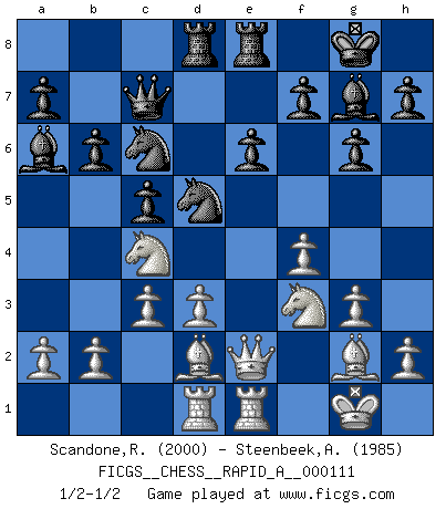 Last move : 1/2-1/2 2011 August 31 18:14:45 [Event "FICGS__CHESS__RAPID_A__000111"] [Site "FICGS"] [Date "2011.07.25"] [Round "1"] [White "Scandone,Raffaele"] [Black "Steenbeek,Adri"] [Result "1/2-1/2"] [WhiteElo "2000"] [BlackElo "1985"] 1.e4 c5 2.d3 Nc6 3.g3 g6 4.Bg2 Bg7 5.f4 e6 6.Nf3 Nge7 7.O-O O-O 8.c3 b6 9.Na3 Ba6 10.Re1 Rb8 11.Nc4 d5 12.exd5 Nxd5 13.Bd2 Qc7 14.Qe2 Rbd8 15.Rad1 Rfe8 1/2-1/2 Sicilian defense Kingside Castling by player White (move 7) Kingside Castling by player Black (move 7) This chess game ended in a draw. Follow this game move after move (download)I know people who have all the will in the world, but still can't play good Chess. (Bobby Fischer) Ich war zu klein für die Schach-Schülermannschaft! (Woody Allen) No soy una persona materialista y por eso, no resiento la falta o pérdida del dinero. La ausencia de cosas mundanas carece de importancia. Ya que el Ajedrez es una forma en la que puedo ser tan materialista como yo desee sin tener la necesidad de vender mi alma. (Jamie Walter Adams) Vous savez, camarade Pachman, je n'éprouve pas de plaisir à être ministre, je jouerais plutôt aux échecs comme vous, ou alors ferais une révolution au Venezuela. (Che Guevara à Ludek Pachman, 'Checkmate in Prague', 1975) God, you are such an idiot. - Actually, I thought I was more of a jerk. (Gregory House to Stacy Warner, House M.D.)
