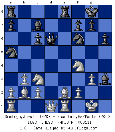 Last move : 1-0 2011 September 29 11:10:55 [Event "FICGS__CHESS__RAPID_A__000111"] [Site "FICGS"] [Date "2011.07.25"] [Round "1"] [White "Domingo,Jordi"] [Black "Scandone,Raffaele"] [Result "1-0"] [WhiteElo "1920"] [BlackElo "2000"] 1.e4 e5 2.Nf3 Nc6 3.Bc4 Nf6 4.Ng5 d5 5.exd5 Na5 6.Bb5+ c6 7.dxc6 bxc6 8.Be2 h6 9.Nf3 e4 10.Ne5 Bd6 11.d4 exd3 12.Nxd3 Qc7 13.b3 O-O 14.Bb2 Re8 15.h3 Qe7 16.Nc3 Bf5 17.O-O Bc7 18.Re1 Qd6 19.g3 Bxh3 20.Nf4 1-0 This chess game has been lost on time (started : 2011.07.25 20:7:28) Two knights defense Kingside Castling by player Black (move 13) Kingside Castling by player White (move 17) Player White won this chess game. Follow this game move after move (download)Morphy was probably the greatest genius of them all. (Bobby Fischer) Wie gewinnt Tal? Er entwickelt alle seine Figuren in die Brettmitte und opfert sie dann irgendwo. (Robert James Fischer) No volvere nunca a jugar contigo. Has insultado a mi amigo. - cuando un oponente se maldijo por una mala jugada (Miguel Najdorf) Je menace de comprendre la position. (Anonyme) In every real man a child is hidden that wants to play. (Friedrich Nietzsche)