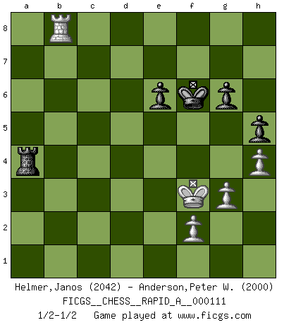 Last move : 1/2-1/2 2011 October 16 14:42:9 [Event "FICGS__CHESS__RAPID_A__000111"] [Site "FICGS"] [Date "2011.07.25"] [Round "1"] [White "Helmer,Janos"] [Black "Anderson,Peter W."] [Result "1/2-1/2"] [WhiteElo "2042"] [BlackElo "2000"] 1.Nf3 d5 2.c4 e6 3.g3 Nf6 4.Bg2 Be7 5.O-O O-O 6.d4 dxc4 7.Qc2 b5 8.a4 b4 9.Nbd2 Bb7 10.Rd1 a5 11.Nxc4 Be4 12.Qb3 Qd5 13.Ne1 Bxg2 14.Nxg2 Nbd7 15.Nf4 Qb7 16.Be3 Rfc8 17.Nd3 Nd5 18.Rac1 c5 19.Nxc5 Bxc5 20.dxc5 Nxc5 21.Bxc5 Rxc5 22.Ne5 Rc7 23.Rxc7 Qxc7 24.Nc4 Nb6 25.Qf3 Rc8 26.Nxb6 Qxb6 27.Rd7 f5 28.Qd3 Rc1+ 29.Kg2 Qc5 30.Rd6 Kf7 31.Ra6 Qc4 32.Qxc4 Rxc4 33.Rxa5 Rc2 34.b3 Rc3 35.e4 fxe4 36.Re5 Rxb3 37.Rxe4 Rb2 38.Kf3 b3 39.Rb4 Ra2 40.Rxb3 Rxa4 41.h4 h5 42.Rb5 g6 43.Rb3 Kf6 44.Rb8 1/2-1/2 Reti Opening Kingside Castling by player White (move 5) Kingside Castling by player Black (move 5) 10 pieces endgame at move 40 : White KRPPP , Black KRPPP WHITE : King + 1 Rook 3 Pawns BLACK : King + 1 Rook 3 Pawns This chess game ended in a draw. Follow this game move after move (download)It is not a move, even the best move that you must seek, but a realizable plan. (Eugene Znosko-Borovsky) Ich bin stolz ein Bulgare zu sein. (Veselin Topalov) La señal de un Gran Maestro es su habilidad de ganar una partida rápidamente y sin dolor. (Irving Chernev) Aucun coup ne doit être joué sans but. (Pedro Damiano) An expert is a man who has made all the mistakes which can be made in a very narrow field. (Niels Bohr)