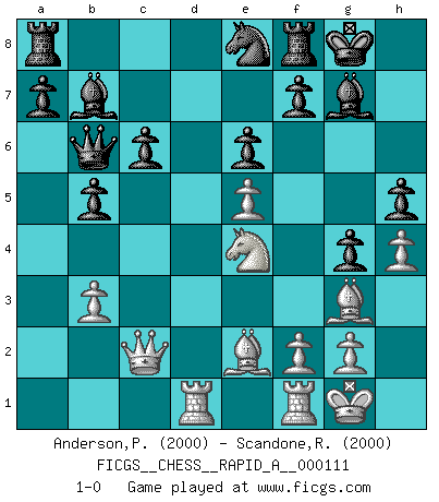 Last move : 1-0 2011 September 22 22:43:22 [Event "FICGS__CHESS__RAPID_A__000111"] [Site "FICGS"] [Date "2011.07.25"] [Round "1"] [White "Anderson,Peter W."] [Black "Scandone,Raffaele"] [Result "1-0"] [WhiteElo "2000"] [BlackElo "2000"] 1.d4 d5 2.c4 c6 3.Nf3 Nf6 4.Nc3 e6 5.Bg5 h6 6.Bh4 dxc4 7.e4 g5 8.Bg3 b5 9.Ne5 h5 10.h4 g4 11.Be2 Bb7 12.O-O Nbd7 13.Qc2 Nxe5 14.Bxe5 Bg7 15.b3 cxb3 16.axb3 O-O 17.Bg3 Qxd4 18.Rad1 Qb6 19.e5 Ne8 20.Ne4 1-0 This chess game has been lost on time (started : 2011.07.25 20:7:28) QGD Slav : 4.Nc3 Kingside Castling by player White (move 12) Kingside Castling by player Black (move 16) Player White won this chess game. Follow this game move after move (download)First-class players lose to second-class players because second-class players sometimes play a first-class game. (Siegbert Tarrasch) Schach sollte überall auf der Welt Schulfach werden. Es fördert die geistige Auseinandersetzung. Es lehrt die Demut in der Niederlage. (Garry Kasparov) Con el fin de mejorar tu juego, debes de estudiar los finales antes que todo, ya que mientras que los finales pueden ser estudiados y dominados por sí mismos, el juegomedio y la apertura deben de ser estudiados en relación con los finales. (José Raúl Capablanca) Mais n'est-ce pas déjà le limiter injurieusement que d'appeler les échecs un jeu? N'est-ce pas aussi une science, un art, ou quelque chose qui, comme le cercueil de Mahomet entre ciel et terre, est suspendu entre l'un et l'autre, et qui réunit un nombre incroyable de contraires ? (Stefan Zweig) When you don't know what to do, walk fast and look worried. (Anonymous)