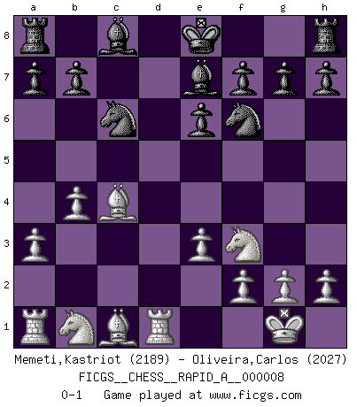 Last move : 0-1 2007 February 23 23:41:22 [Event "FICGS__CHESS__RAPID_A__000008"] [Site "FICGS"] [Date "2006.12.28"] [Round "1"] [White "Memeti,Kastriot"] [Black "Oliveira,Carlos"] [Result "0-1"] [WhiteElo "2189"] [BlackElo "2027"] 1.d4 d5 2.c4 dxc4 3.Nf3 Nf6 4.e3 c5 5.Bxc4 e6 6.O-O Be7 7.dxc5 Qxd1 8.Rxd1 Bxc5 9.a3 Nc6 10.b4 Be7 0-1 This chess game has been lost on time (started : 2006.12.28 1:16:19) QGA, 4.e3 Kingside Castling by player White (move 6) Player Black won this chess game. Follow this game move after move (download)Chess is a fairy tale of 1001 blunders. (Savielly Tartakower) Im Reiche der Wirklichkeit ist man nie so glücklich wie im Reiche der Gedanken. (Arthur Schopenhauer) Por tratar de evitar la pérdida de una pieza, muchas personas han perdido una partida de Ajedrez. (Savielly Tartakover) On peut tirer plus d'utilité d'une partie perdue que de 100 parties gagnées. (Capablanca) There is a computer disease that anybody who works with computers knows about. It's a very serious disease and it interferes completely with the work. The trouble with computers is that you 'play' with them ! (Richard P. Feynman)