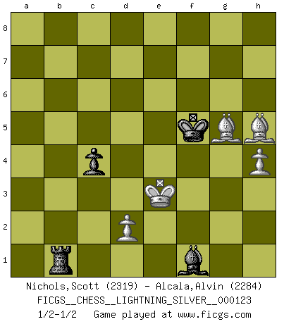 Last move : 1/2-1/2 2011 July 27 20:42:14 [Event "FICGS__CHESS__LIGHTNING_SILVER__000123"] [Site "FICGS"] [Date "2011.07.27"] [Round "1"] [White "Nichols,Scott"] [Black "Alcala,Alvin"] [Result "1/2-1/2"] [WhiteElo "2319"] [BlackElo "2284"] 1.b4 e5 2.Bb2 Bxb4 3.a3 Bd6 4.e3 Nf6 5.g4 h6 6.h4 c6 7.Bh3 Bc7 8.g5 Nd5 9.Qg4 h5 10.Qg2 Na6 11.f4 O-O 12.fxe5 Nc5 13.Ne2 Na4 14.Bd4 Qe7 15.Qe4 Ndb6 16.Bg2 Nc4 17.Nbc3 Nxc3 18.Bxc3 Nxe5 19.Qd4 d5 20.O-O b6 21.Nf4 Bg4 22.a4 Bd6 23.Rf2 Qc7 24.Raf1 Rad8 25.a5 Rfe8 26.Nxd5 cxd5 27.Rxf7 Rd7 28.axb6 axb6 29.g6 Be6 30.R1f5 Red8 31.Rxd7 Rxd7 32.Rxe5 Bxe5 33.Qxe5 Qxe5 34.Bxe5 Bf5 35.c3 Bd3 36.Bh3 Re7 37.Bd4 Bxg6 38.Bxb6 Rb7 39.Bd4 Rb2 40.c4 Rb1+ 41.Kf2 dxc4 42.Bg2 Kh7 43.Kg3 Bf5 44.Bf3 Kh6 45.e4 Be6 46.Be3+ Kg6 47.Bd4 Rb7 48.Bc3 Kh6 49.Bd4 Rd7 50.Be3+ Kg6 51.Be2 Rb7 52.Kf4 Rb1 53.Bf3 Re1 54.Bf2 Rf1 55.Kg3 Bg4 56.Bg2 Rd1 57.Be3 Kf7 58.Kf2 Rb1 59.Kg3 Rb2 60.Bf1 Rc2 61.Kf4 g6 62.Kg3 Rc1 63.Bg2 Be2 64.Bd4 Bf1 65.Bf3 Re1 66.Bc3 Ke6 67.Kf2 Rb1 68.Bd4 Rc1 69.Ke3 Bd3 70.Kf4 Re1 71.Kg3 Kd6 72.Bc3 Kc5 73.Kf2 Rc1 74.Ke3 Rg1 75.Bd4+ Kd6 76.Bf6 Ke6 77.e5 g5 78.Bxg5 Kxe5 79.Bxh5 Rb1 80.Bf4+ Kf5 81.Bg5 Bf1 1/2-1/2 Polish (Sokolsky) opening Kingside Castling by player Black (move 11) Kingside Castling by player White (move 20) 10 pieces endgame at move 78 : White KBBPP , Black KRBPP WHITE : King + 2 Bishops 2 Pawns BLACK : King + 1 Rook 1 Bishop 2 Pawns 9 pieces endgame at move 79 : White KBBPP , Black KRBP WHITE : King + 2 Bishops 2 Pawns BLACK : King + 1 Rook 1 Bishop 1 Pawn This chess game ended in a draw. Follow this game move after move (download)You know you're going to lose. Even when I was ahead I knew I was going to lose. - On playing against Fischer. (Andrew Soltis) Ich bin es gewohnt, das die Jugend mir überhaupt keinen Respekt entgegenbringt. (Alexander Morozewich) La estratégia requiere pensar, la táctica requiere observación. (Max Euwe) Même si vous avez un bon coup à faire, regardez toujours s'il n'y en a pas un qui lui soit préférable. (Pedro Damiano) History is the quarrels of popes and kings, with wars or pestilences in every page; the men all so good for nothing, and hardly any women at all. (Jane Austen)