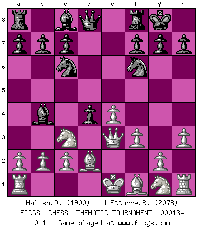 Last move : 0-1 2011 September 23 22:48:42 [Event "FICGS__CHESS__THEMATIC_TOURNAMENT__000134"] [Site "FICGS"] [Date "2011.07.28"] [Round "1"] [White "Malish,Dmitriy"] [Black "d Ettorre,Rodolfo"] [Result "0-1"] [WhiteElo "1900"] [BlackElo "2078"] 1.e4 e5 2.d4 exd4 3.Qxd4 Nc6 4.Qe3 Nf6 5.Bd2 Bb4 6.Nc3 O-O 7.h3 d5 8.f3 d4 0-1 This chess game has been lost on time (started : 2011.07.28 1:15:58) Centre game : Berger variation Kingside Castling by player Black (move 6) Player Black won this chess game. Follow this game move after move (download)Chess is not like life... it has rules ! (Mark Pasternak) Ein typischer, sehr verbreiteter Gedankenschädling ist der, daß der betreffende Amateur von der Annanhme ausgeht, daß jeder einzelne Zug etwas zu leisten habe. (Aaron Nimzowitsch) El ganador de una partida es aquel jugador que hace el penúltimo error. (Savielly Tartakover) L'ordinateur a tué l'originalité. Il n'y a plus guère d'aventures sur l'échiquier. (Jacob Murray) The general who wins the battle makes many calculations in his temple before the battle is fought. The general who loses makes but few calculations beforehand. (Sun Tzu)
